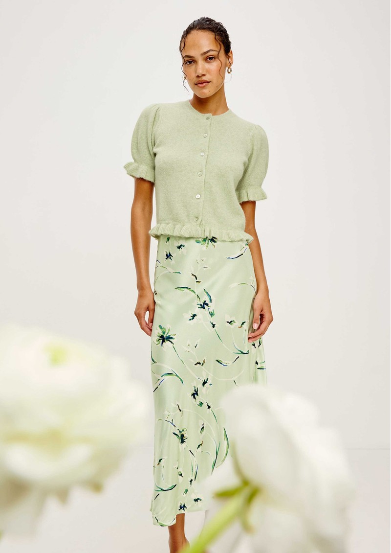 The Rails Anya Midi Skirt in Mint Linnea is a high-rise, body-skimming piece crafted from lustrous satin-back crepe in a soft viscose-rayon blend. Designed with a bias cut for a flattering silhouette, it features a concealed elastic waistband for a polished, comfortable fit, making it a versatile addition to both casual and dressy outfits.