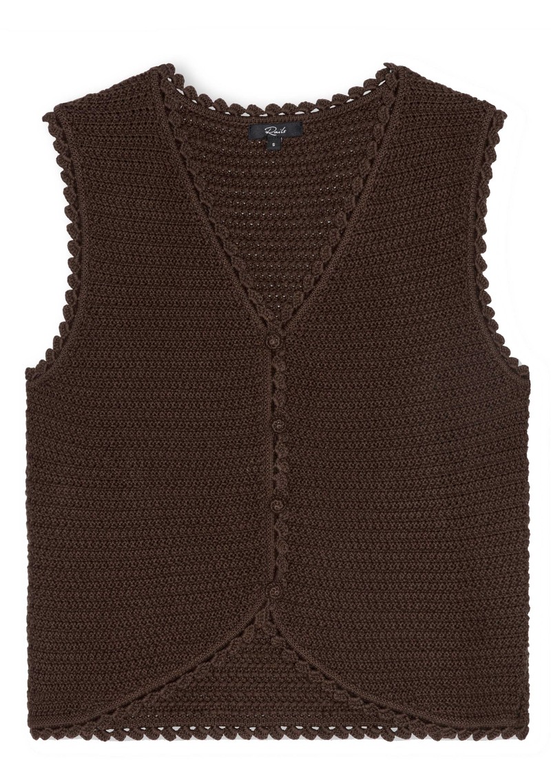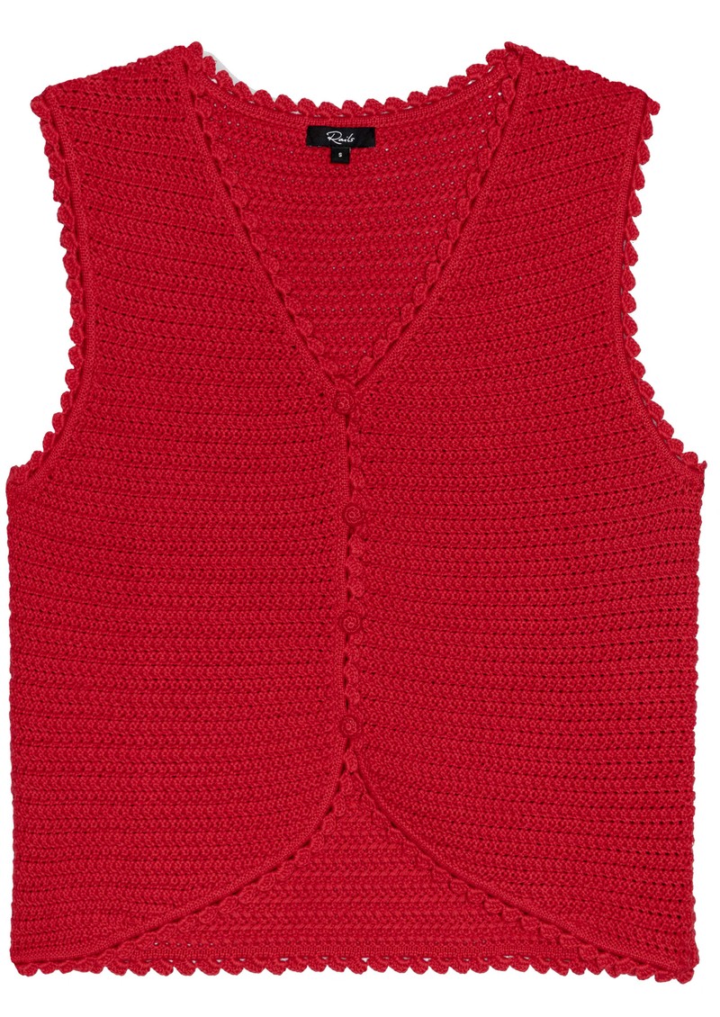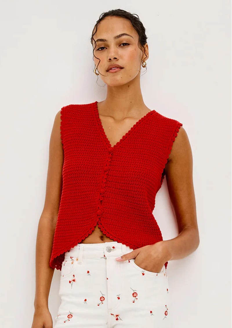 The Rails Calypso Knitted Vest in scarlet is a vibrant, chic layering essential. Crafted from an ultra-soft knit, it offers a relaxed, sleeveless silhouette, a flattering V-neckline, charming crochet buttons down the front, and subtle scalloped edges for a feminine finish.