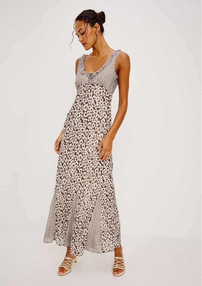 Introducing the feminine Rails Dahlia Dress, designed in a gorgeous brown Daisy print. This pretty dress features a U shaped neckline with a ruffle detail at the bust. This sleeveless dress features a gorgeous gingham print at the bust and hem. Rails dress also features: