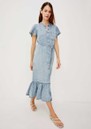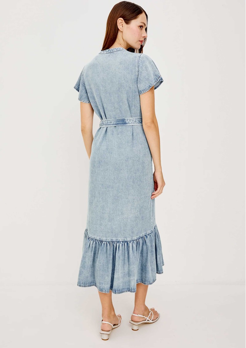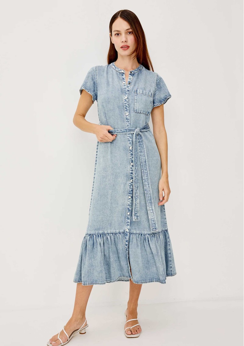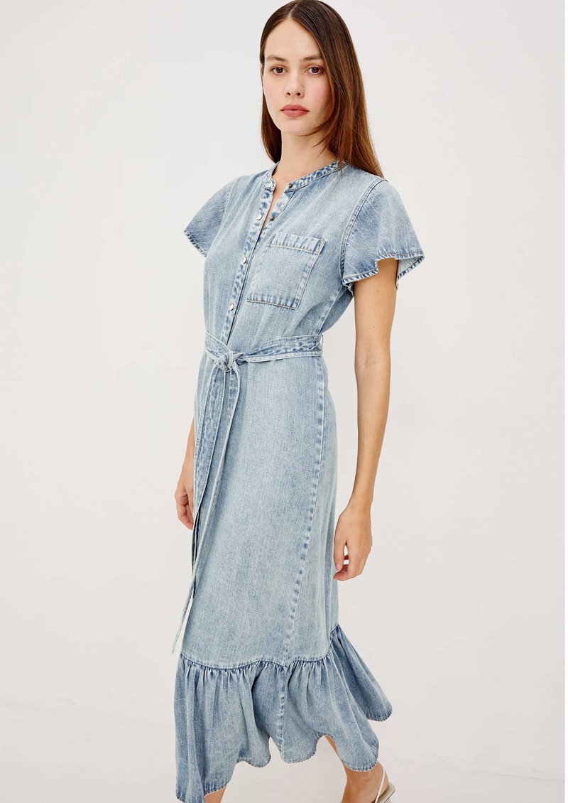 The Rails Kahlo dress in faded indigo is a breezy, stylish denim piece perfect for effortless summer dressing. Featuring a soft rounded neckline, central buttons, a front patch pocket, and short flutter sleeves, it combines classic shirt dress details with a modern twist. The adjustable waist belt and tiered, frilled hem add shape and movement for a flattering, relaxed silhouette.