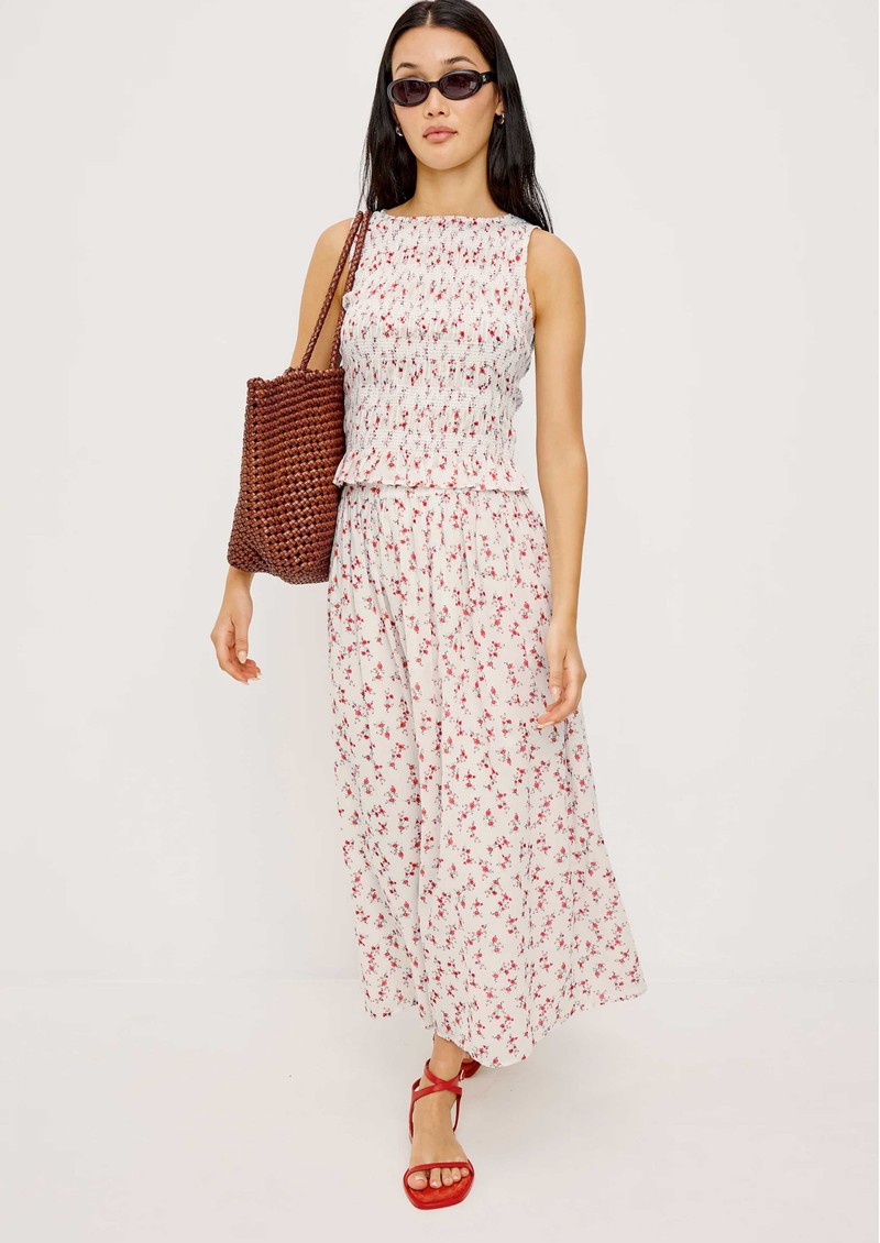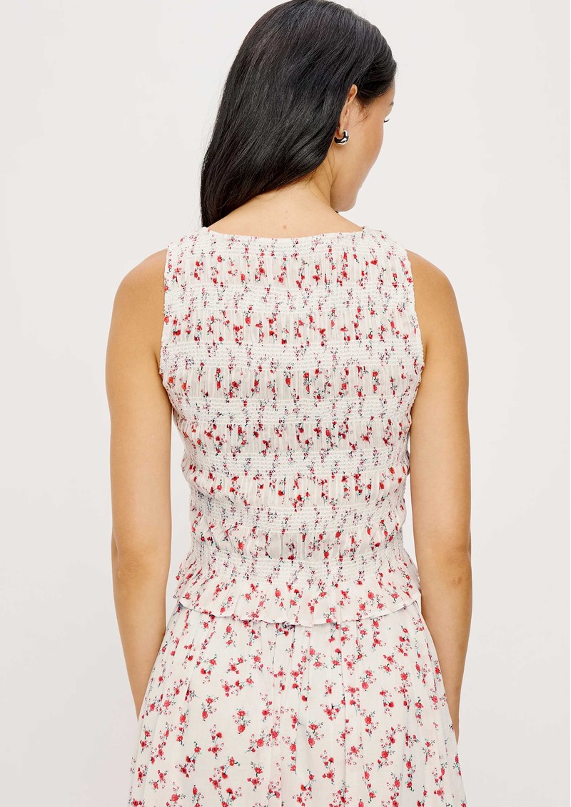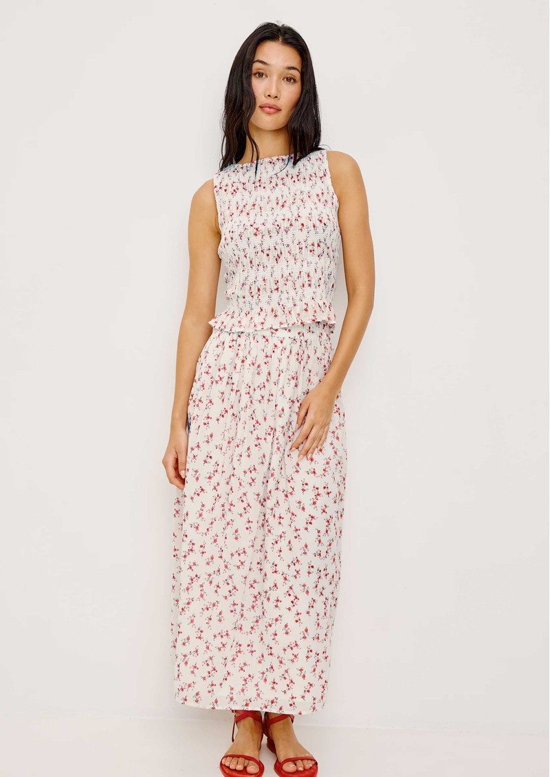The Rails Kane Smocked Sleeveless Top in Rouge Romantic is a charming, lightweight cotton piece adorned with an all-over ditsy floral print. It features a fitted diamond-smocked bodice for a flattering shape, a classic boat neckline, and a flared ruffle hem for a playful, feminine finish.