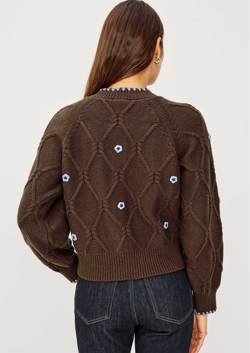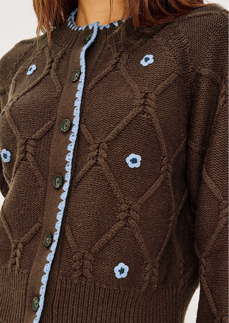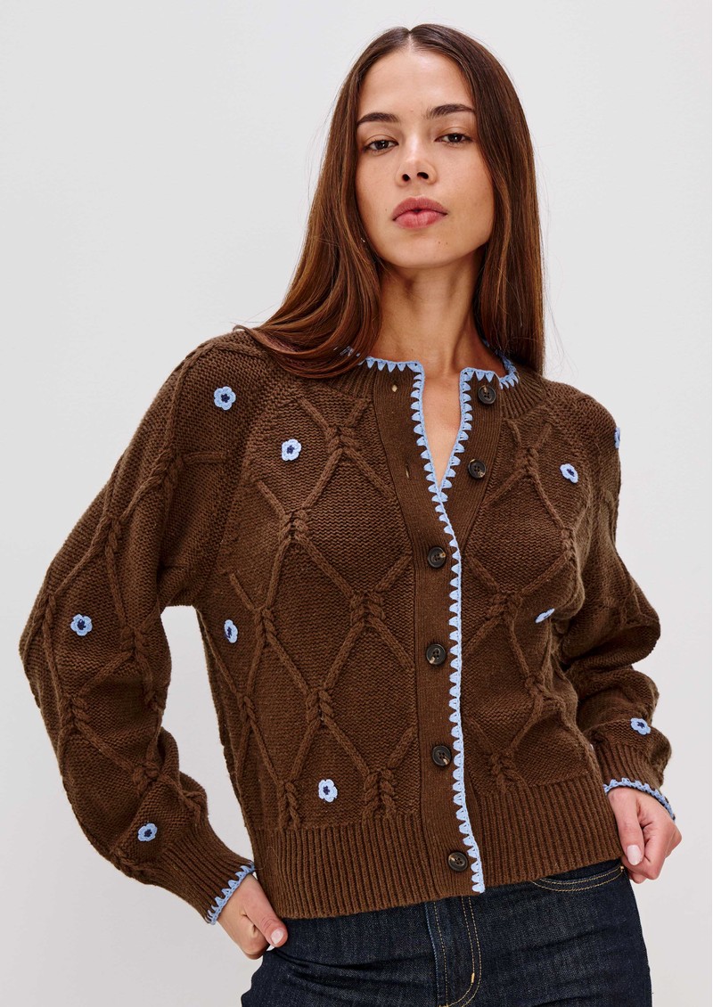 The Rails Laurie knitted cardigan combines cosy sophistication with playful detail, featuring a warm brown base adorned with intricate cable knit patterns, blue embroidered daisies, and contrasting blue zig-zag trims. It offers a rounded neckline, voluminous sleeves, and ribbed hems for a flattering, comfortable fit.