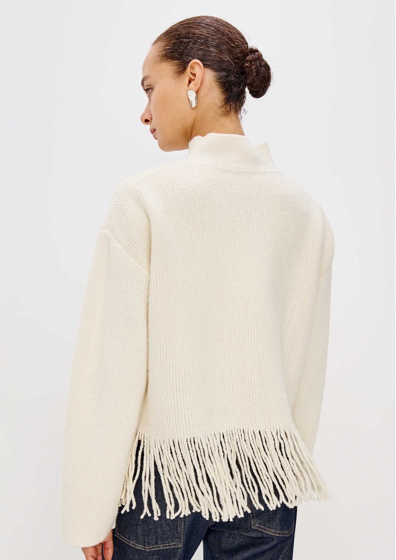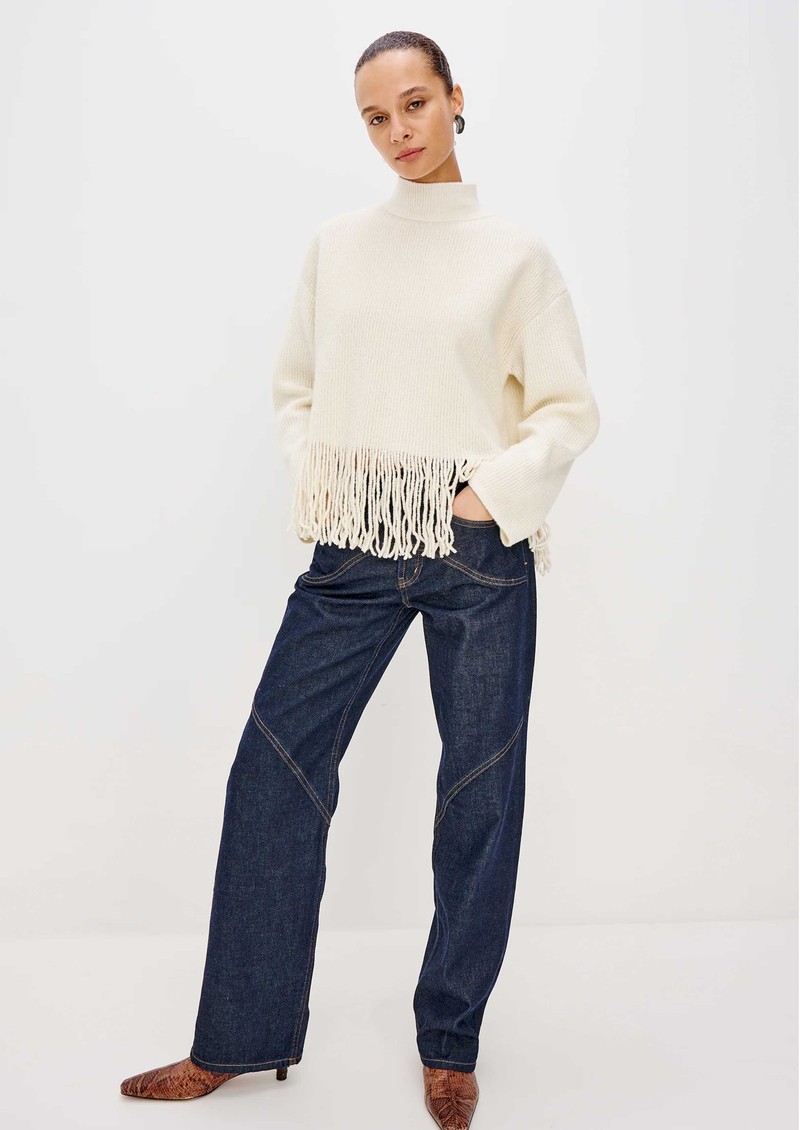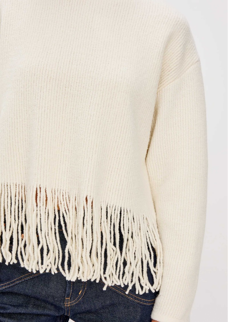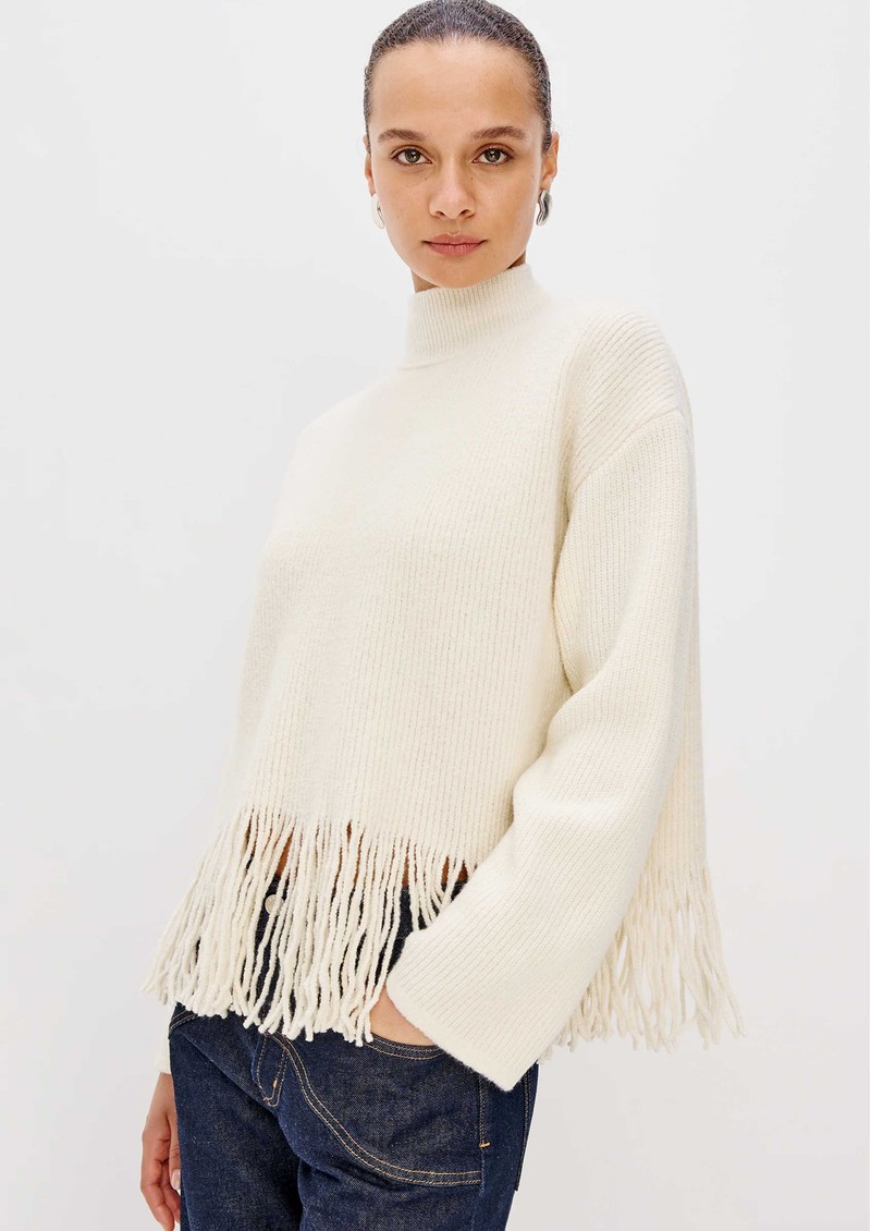 The Rails Lise fringed jumper is a cosy, ribbed-knit sweater with a soft, warm finish. It features a boxy cropped fit, fringe detailing at the hem, a turtleneck, and long sleeves for a stylish, contemporary look.