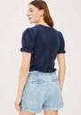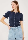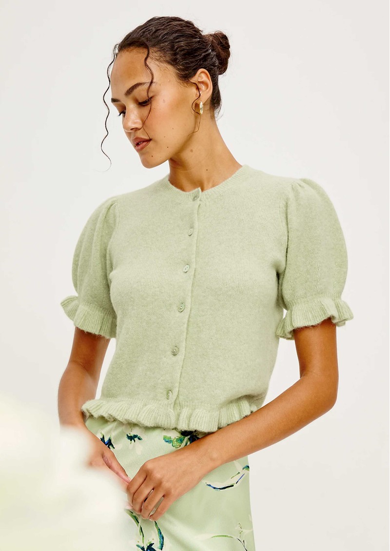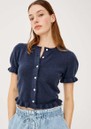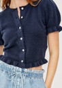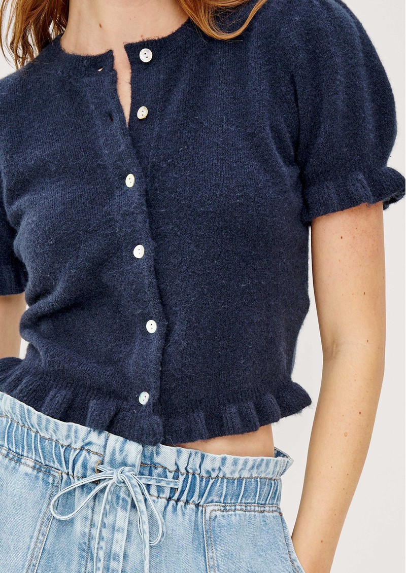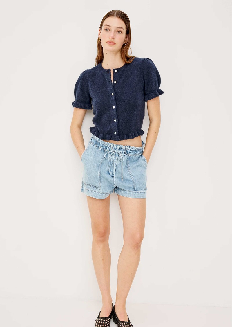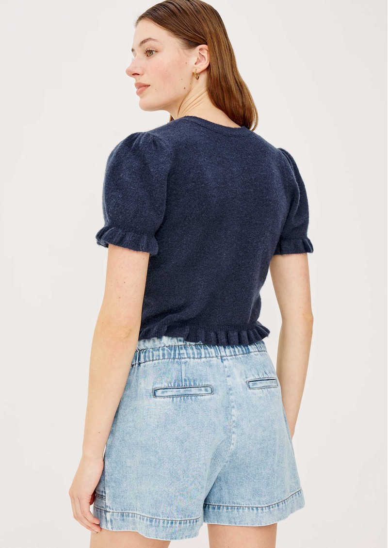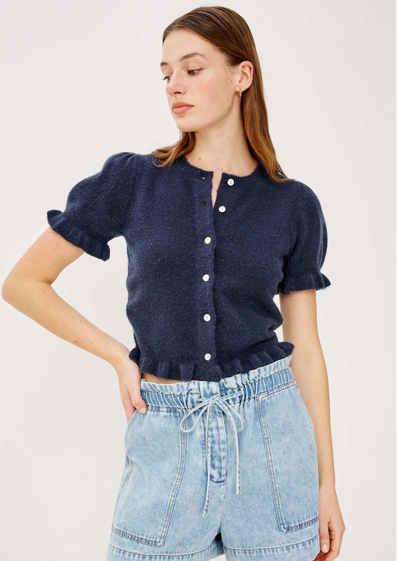 The Rails Lora Cardigan in navy is a timeless, versatile layer that adds effortless polish to any outfit. Crafted from a soft wool-blend, it features a classic crew neck, button-front fastening, and charming ruffle accents on the short puff sleeves and hem for a delicate, feminine touch.