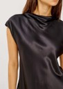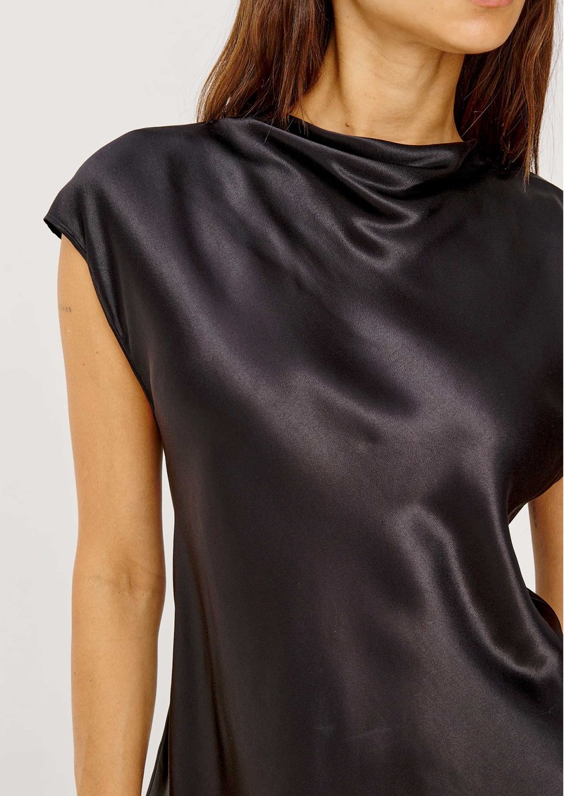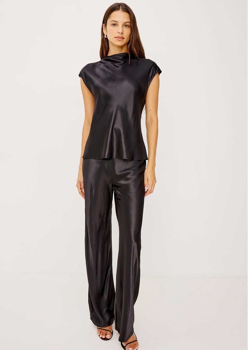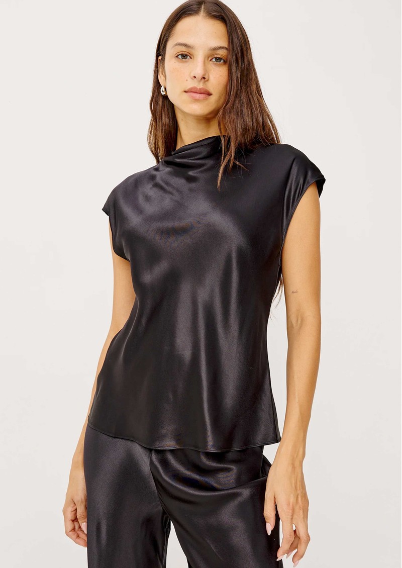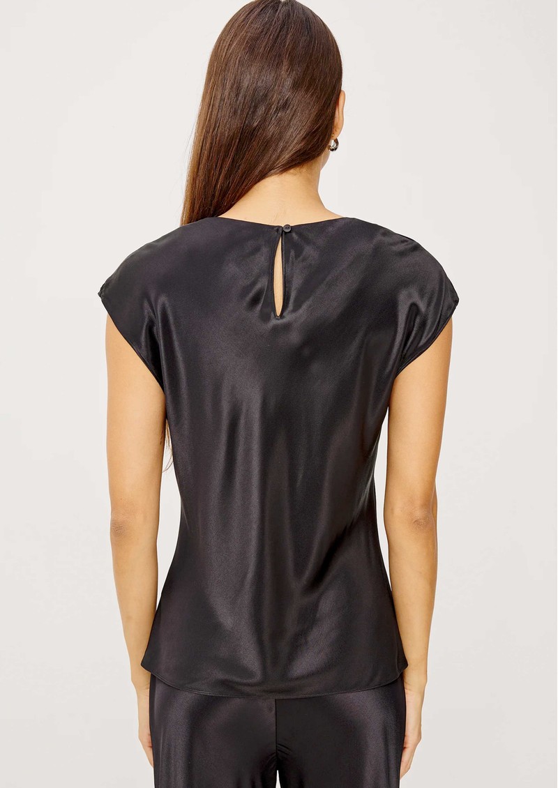 The Rails Loretta satin top in black combines elegant drape with luxurious texture, crafted from a silky satin-blend with a lustrous sheen. Featuring a cowl neckline, cap sleeves, and a buttoned keyhole back cutout, it transitions effortlessly from day to night.