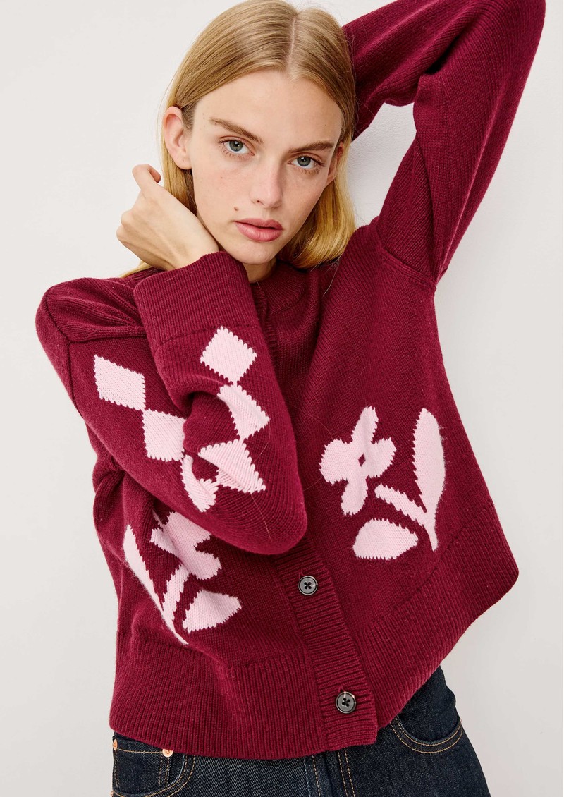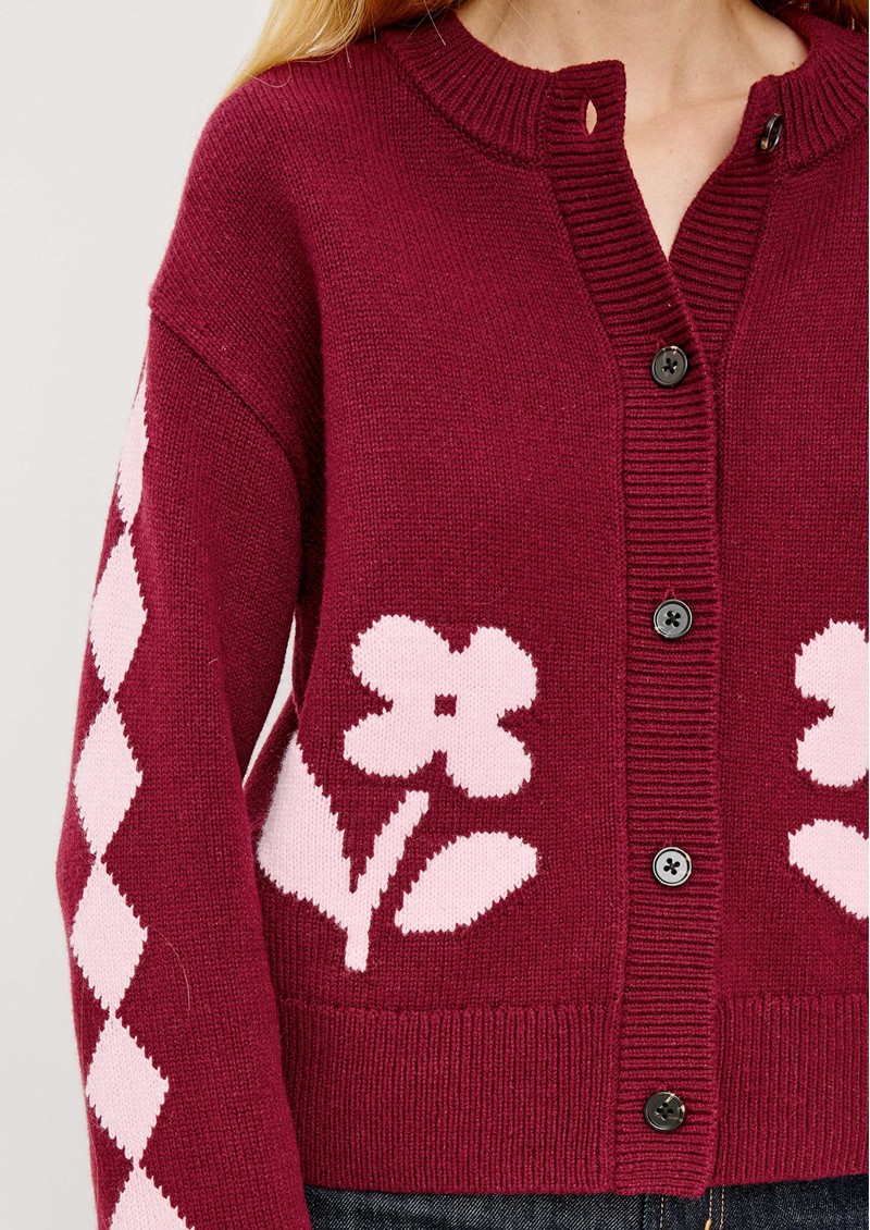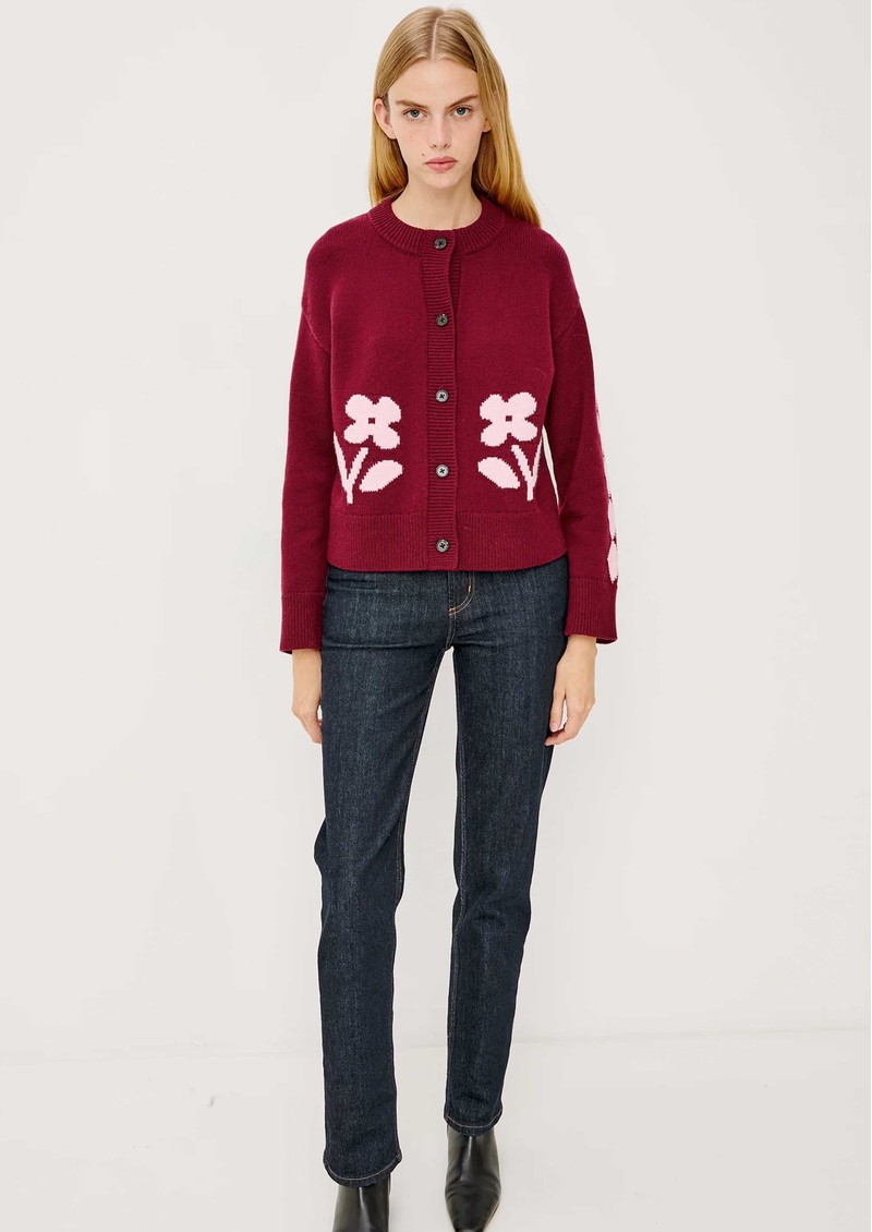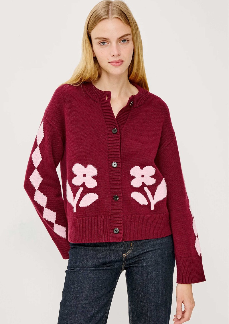 The Rails Mavie cardigan in Garnet Daisy combines classic charm with modern comfort, crafted from a soft wool-blend. Featuring delicate front floral motifs, diamond detailing along the sleeves, long sleeves, and front button closures, it offers a relaxed, effortlessly stylish fit.