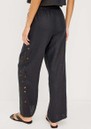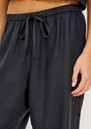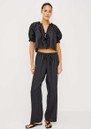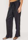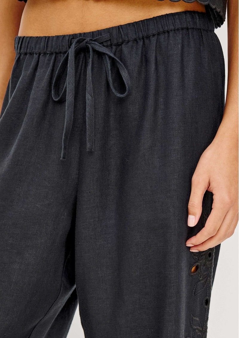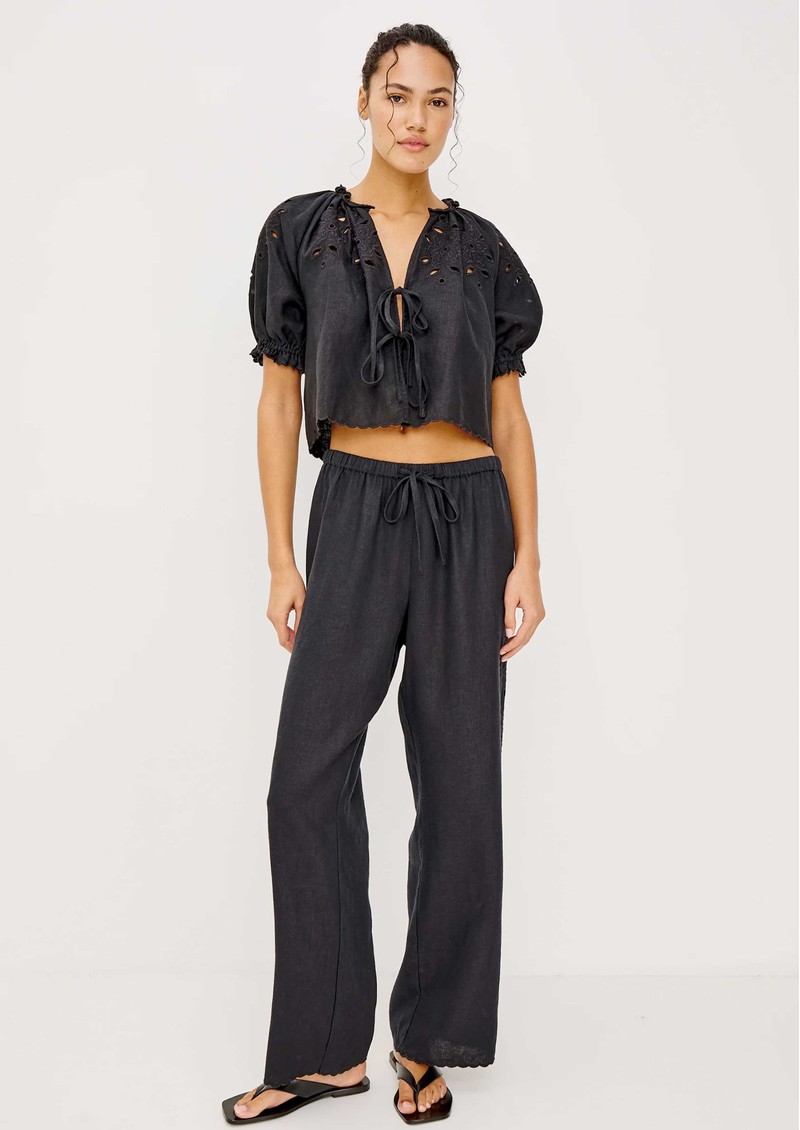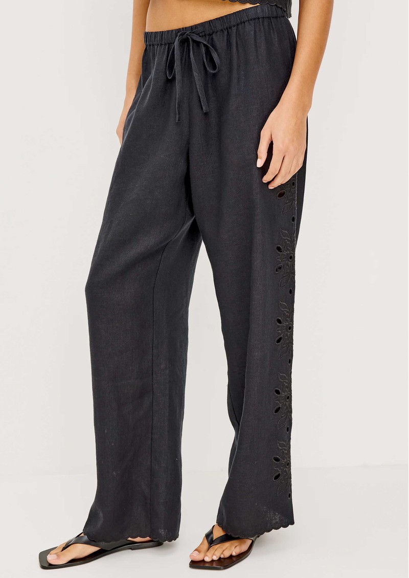 The Rails Mirina Trousers in black are crafted from midweight 100% linen for a relaxed yet polished look. They feature an elastic waistband with adjustable front ties, side pockets, and loose, straight legs for effortless comfort. Finished with delicate floral cutwork and scalloped trim, these trousers bring a subtle, feminine touch to everyday style.