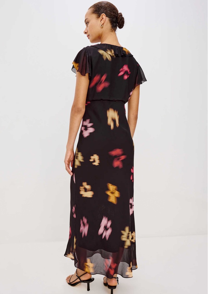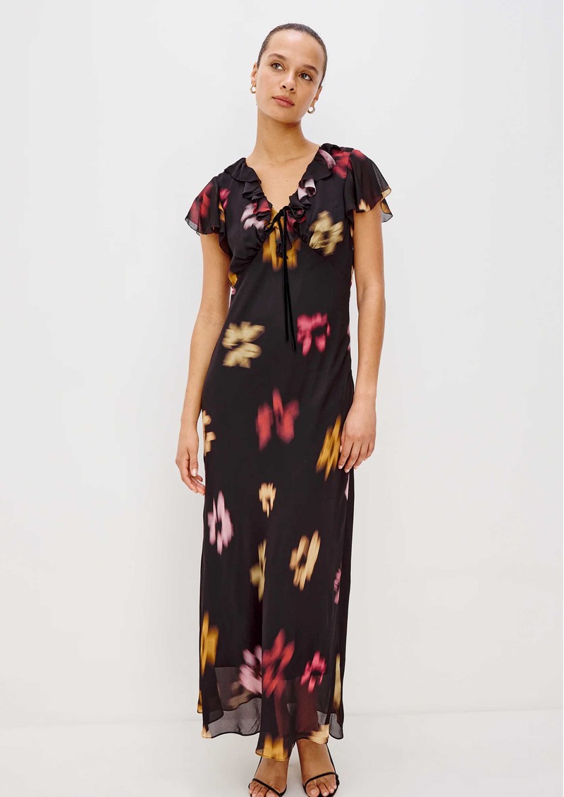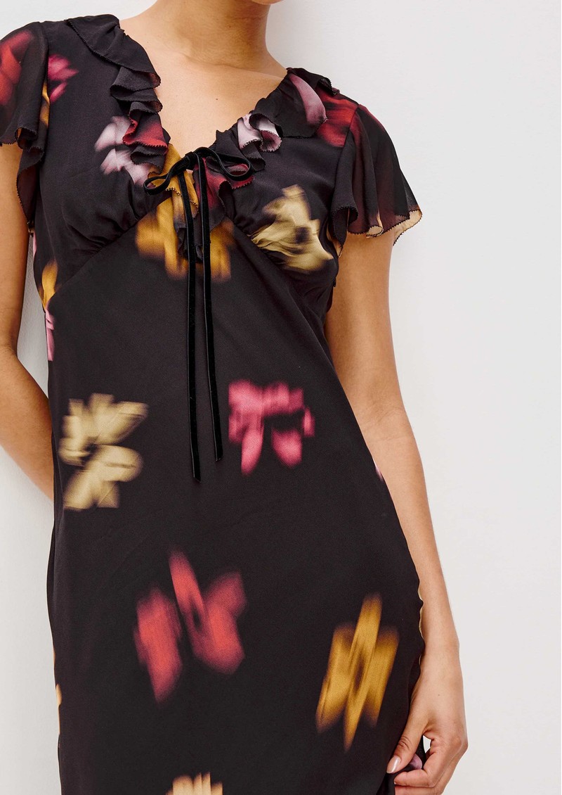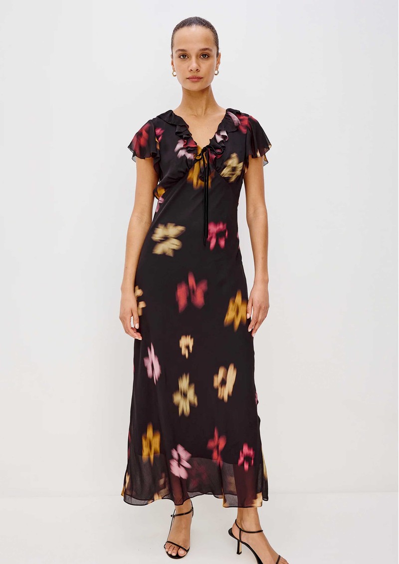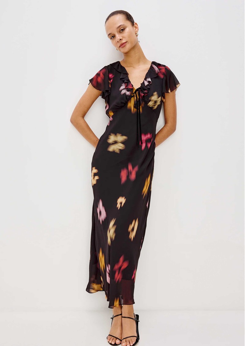 The Rails Neela dress in onyx floral exudes effortless romance with flowing chiffon adorned in soft, blurred florals. Featuring a V-neckline framed by cascading ruffles and a velvet bow, delicate ruffle cap sleeves, and an empire waist, it creates a graceful, elongated midi silhouette.