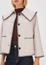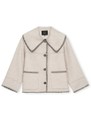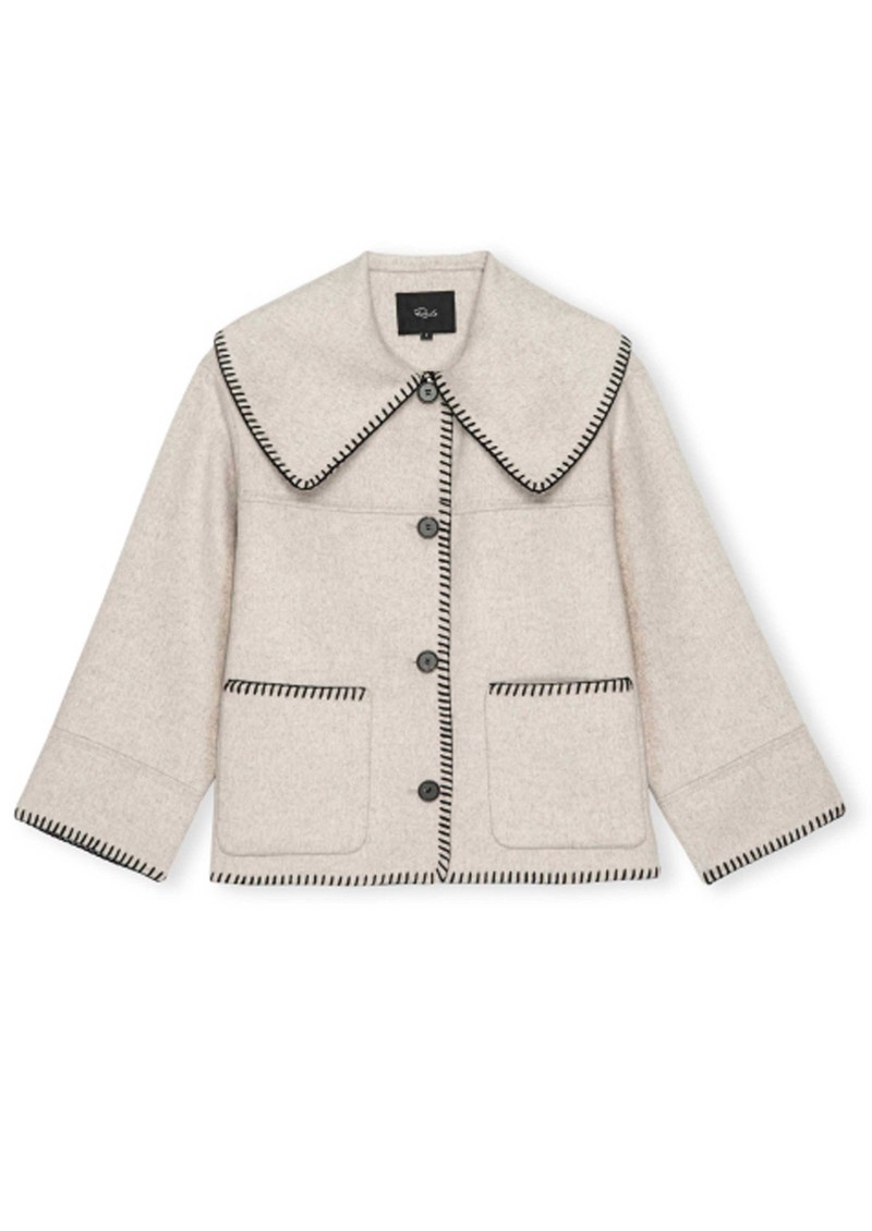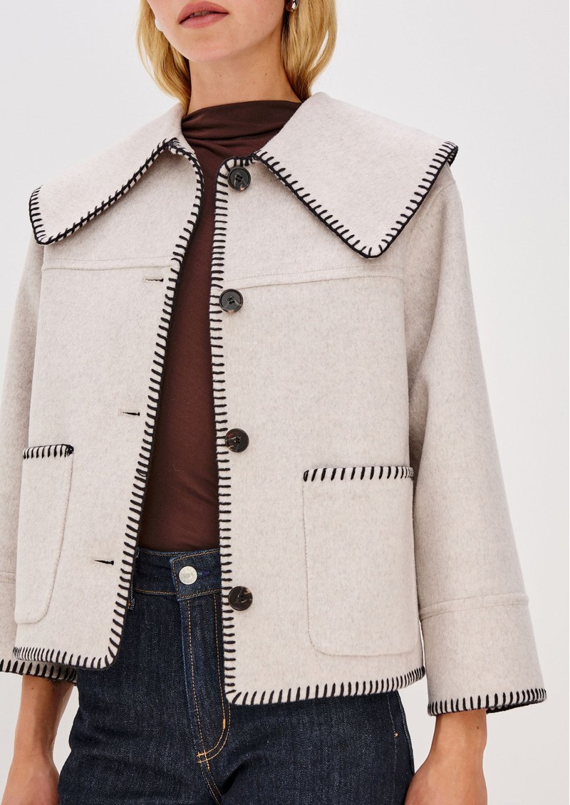The Rails Patty Coat in oatmeal is a standout outerwear piece, crafted from a cosy wool blend with a statement oversized collar and bold black blanket-stitch edging. Featuring a central button closure, full-length sleeves, and a relaxed boxy fit, it’s the perfect mix of structure and softness for cooler days.