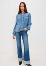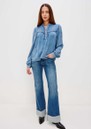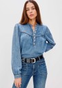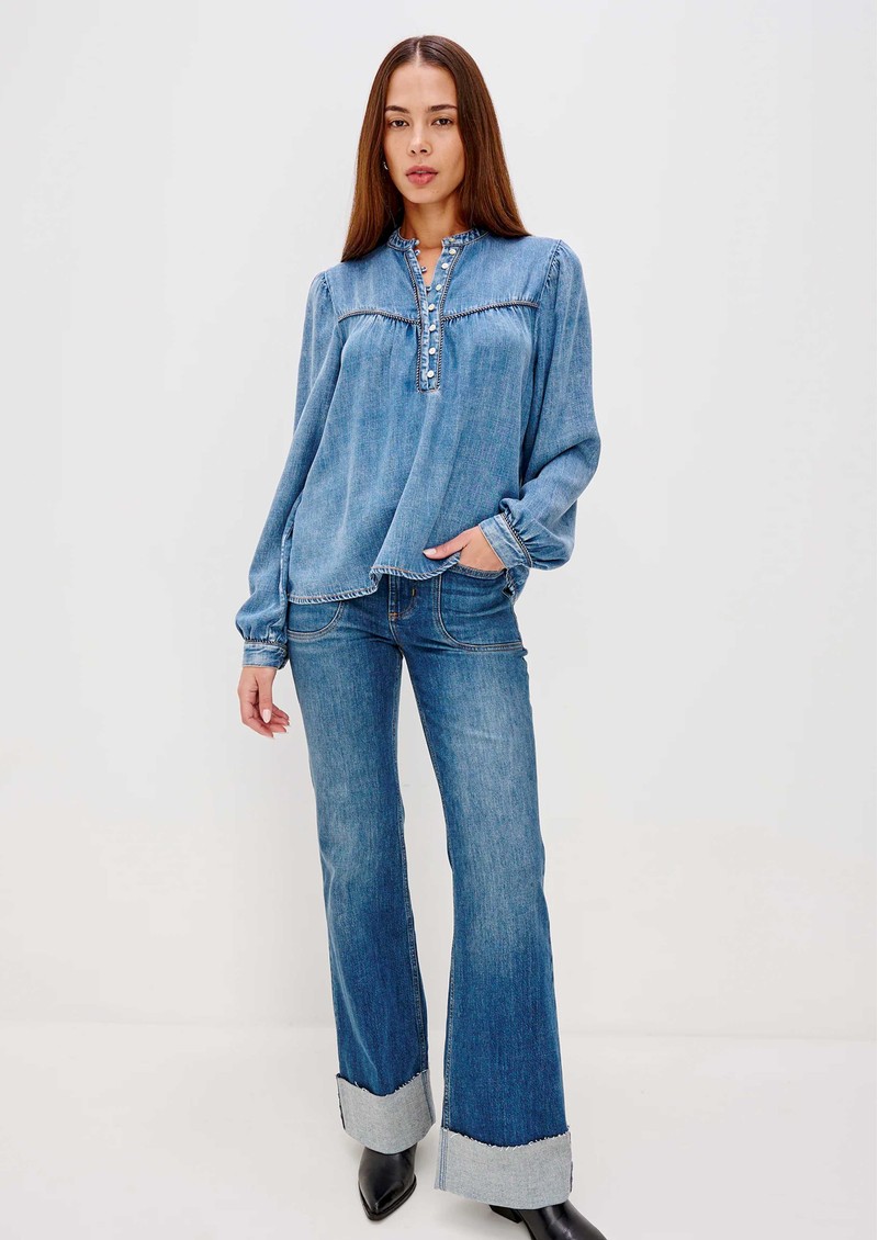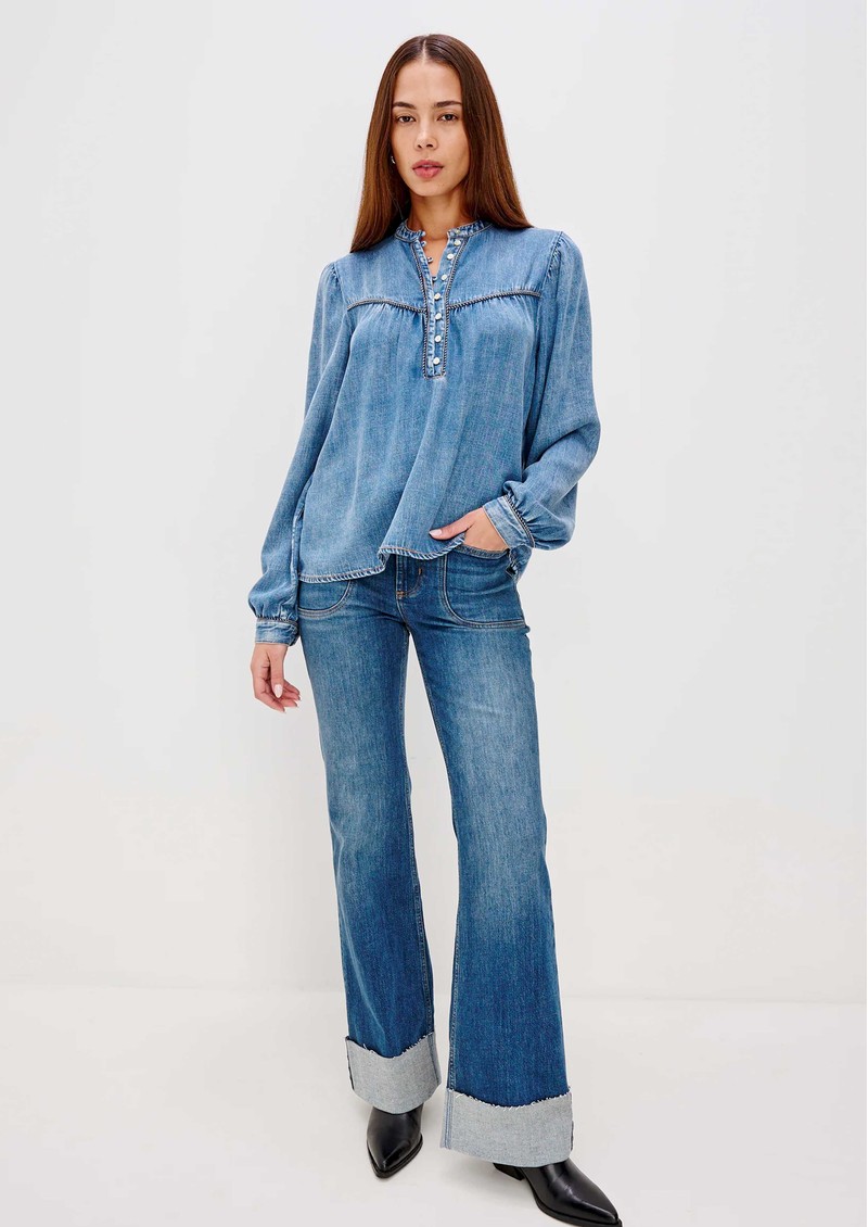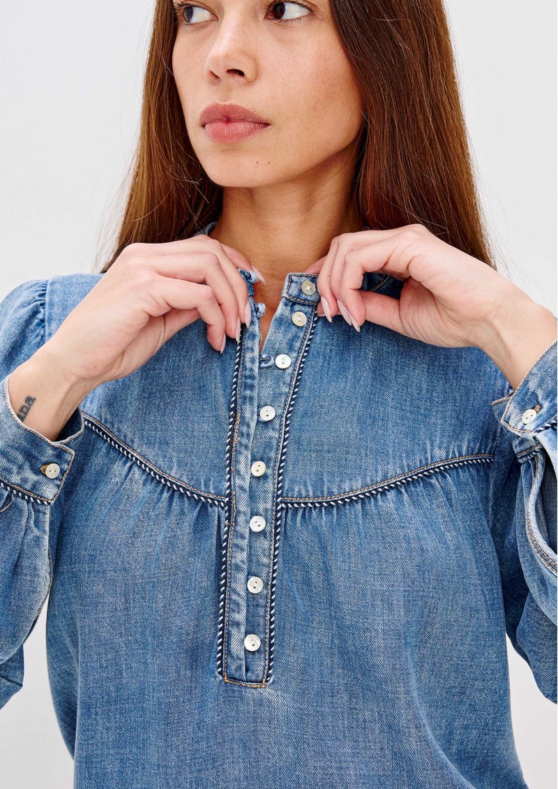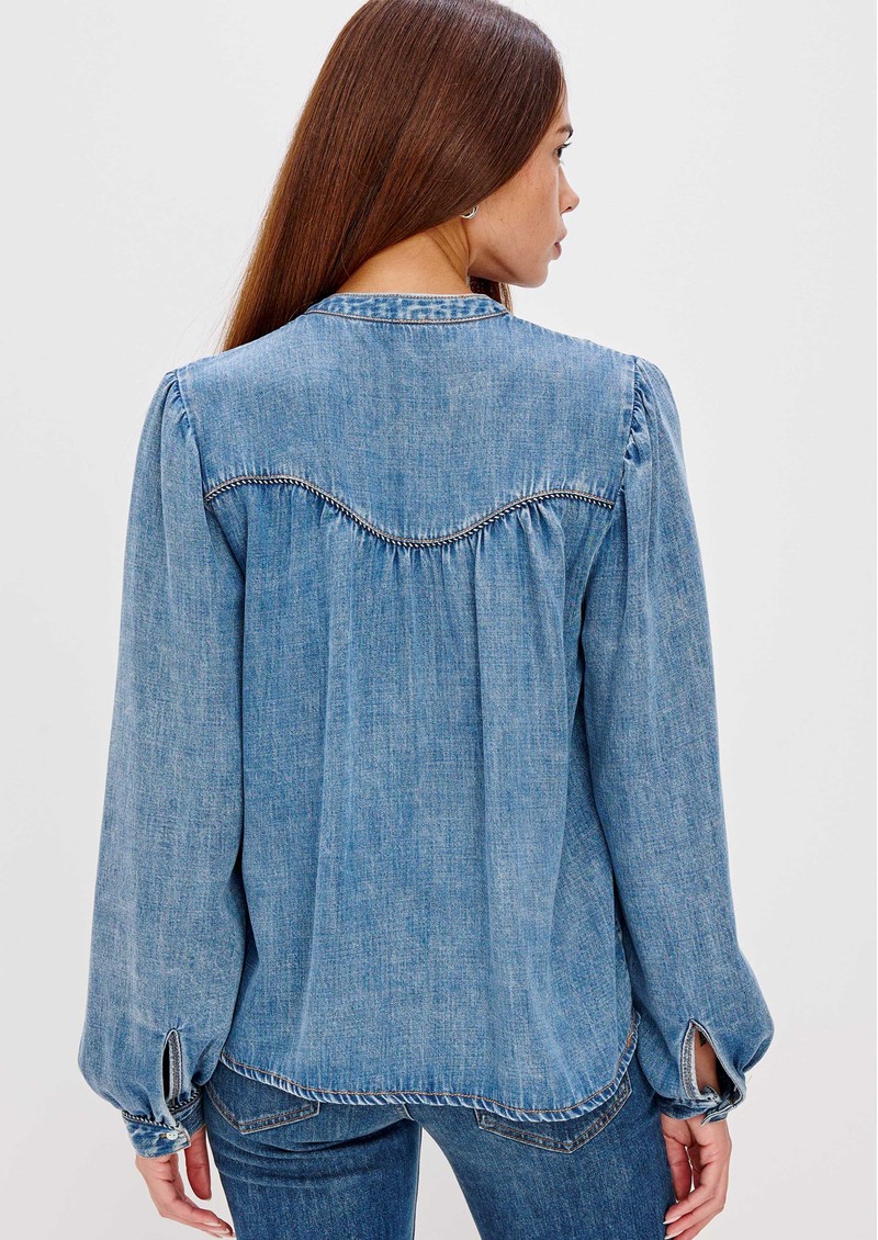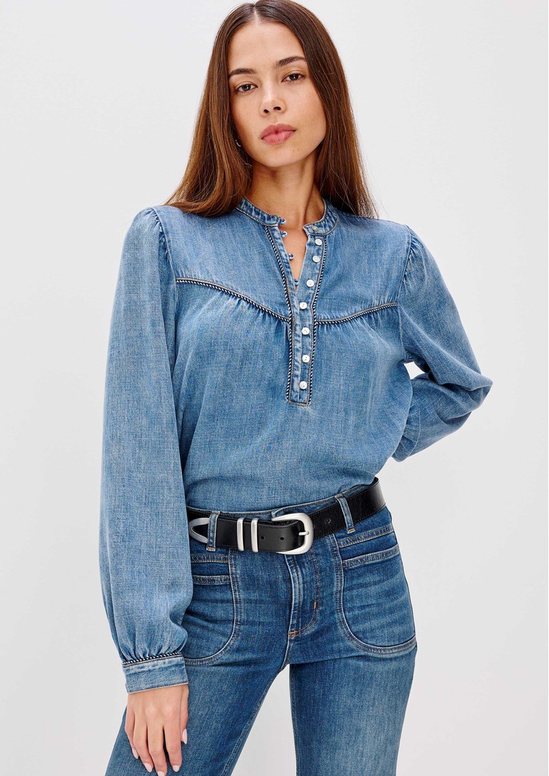 The Rails Sunna shirt in Blue Stone is a classic denim-style piece crafted from soft Tencel with a lived-in wash. It features a half-front placket with shell buttons, two-toned twist piping, a high neckline, and long puff sleeves with fitted cuffs for a timeless, elevated look.