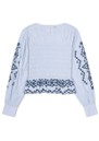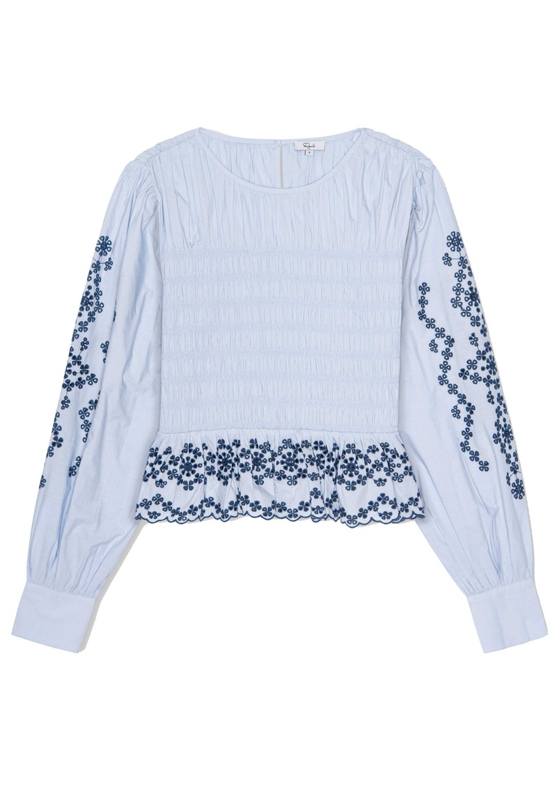 The Rails Tabi blouse in Blue Bird is a charming, feminine piece featuring a light blue base with darker blue embroidered details. It boasts a rounded neckline, subtle puff sleeves with wide wrist cuffs, shirring at the neck, and a smocked, slightly cropped body for a flattering, contemporary fit.