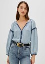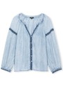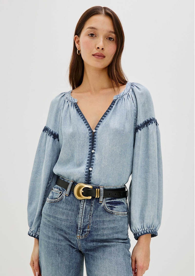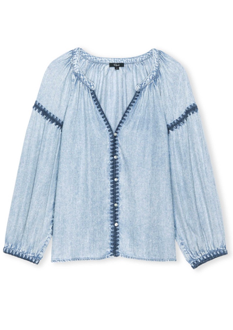 The Rails Toshi Blouse is a light and airy piece crafted from fluid lyocell in a soft light blue hue. Designed with a rounded neckline and central V-cutout, it features delicate pintuck details on the long sleeves, a button-down front, and contrasting dark blue edging for a refined finish.
