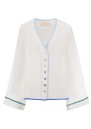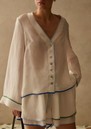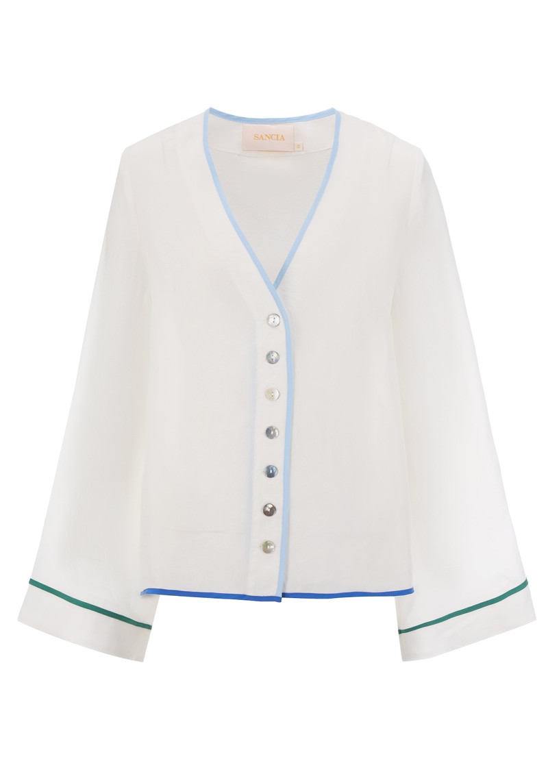 The Sancia Leona Shirt is a perfect summer staple. This classic piece is a timeless A-line shirt that exudes effortless chic. Its collarless design is complemented by a feminine V neck, relaxed, full-length sleeves and delicate shell buttons. Crafted from lightweight fabric. Key features of this Sancia top are: