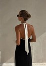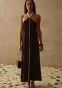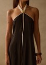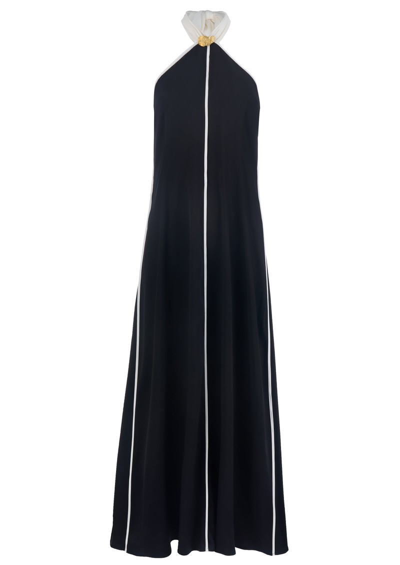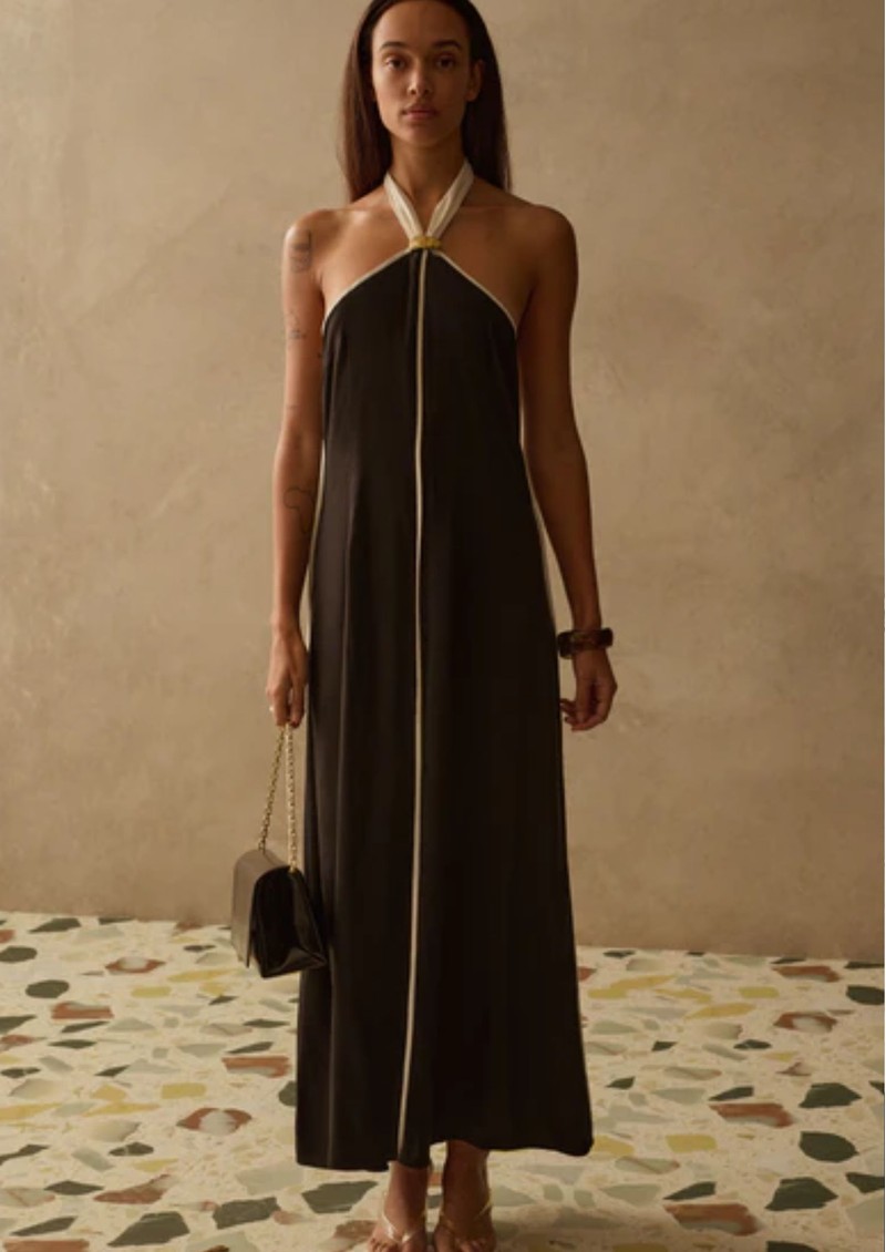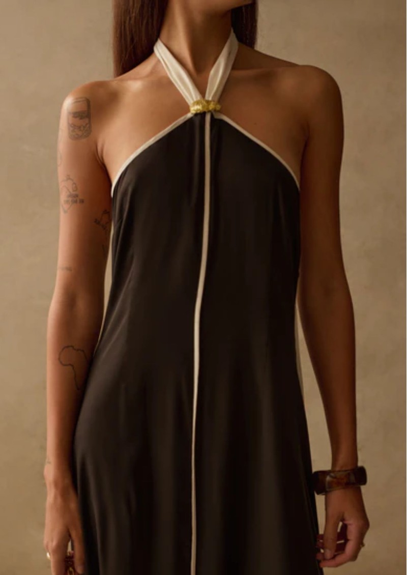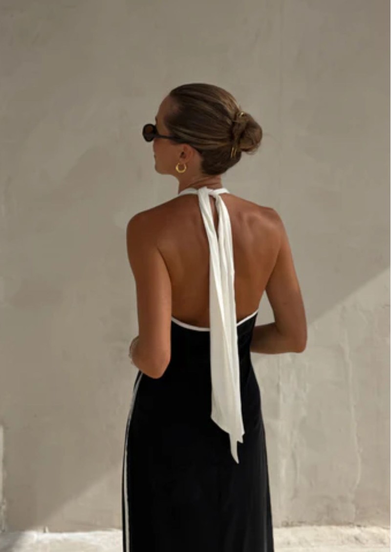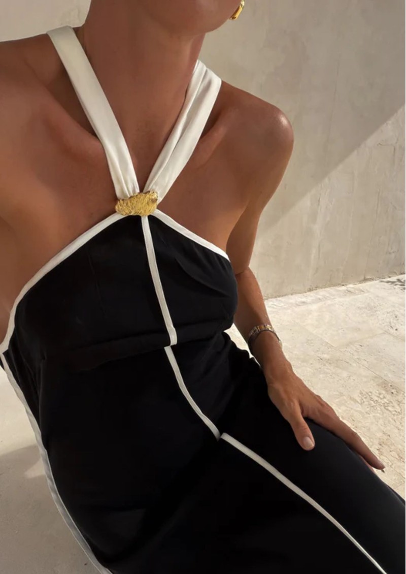 The Sancia Savannah Dress is a sleek slip-style design with a chic minimalist silhouette. It features a striking contast white detailing and an elegant halter neckline, creating a refined look. With its soft, flowing shape, this piece is ideal for those who appreciate a relaxed fit that offers both comfort and effortless style. Key features of this Sancia dress are: