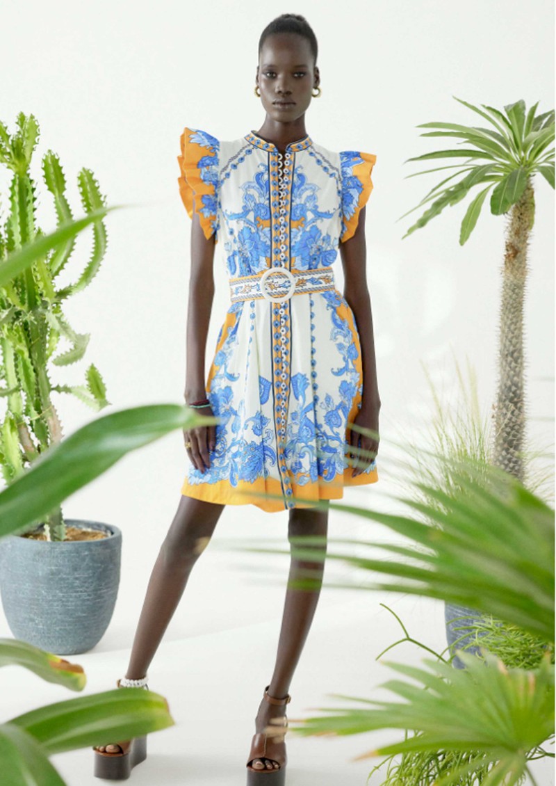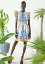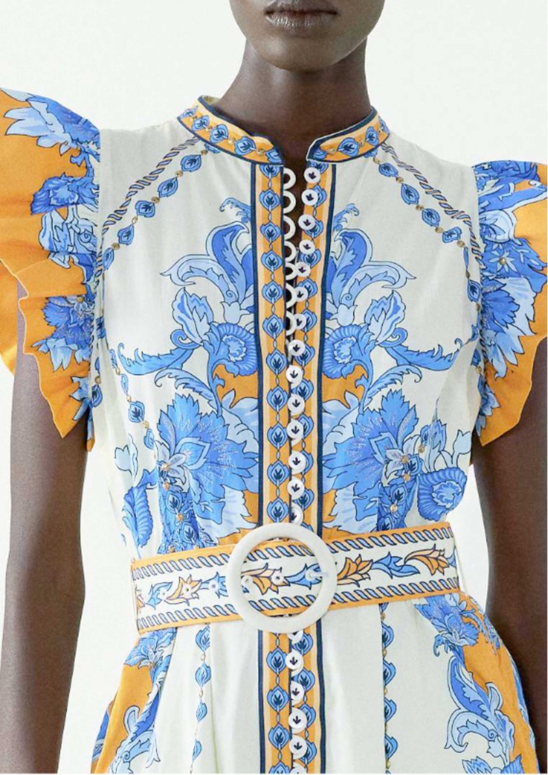 The Scarlett Poppies Baronessa Dress in papyrus/blue is a fit-and-flare silhouette with a defined waist, playful ruffle sleeves, and a detachable belt with a fabric-covered buckle, blending modern femininity with Art Nouveau-inspired artistry. Featuring a classic collar, centre-front placket, contrast-stitched mother-of-pearl buttons, and a placement-engineered floral print enhanced with lurex thread embroidery and metallic sequins.