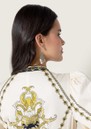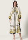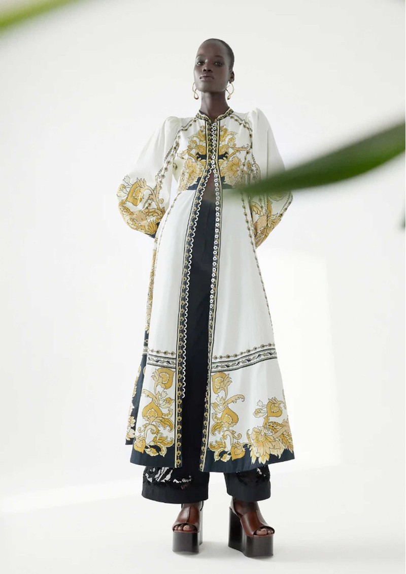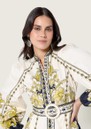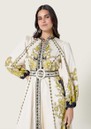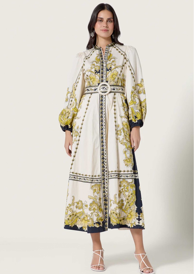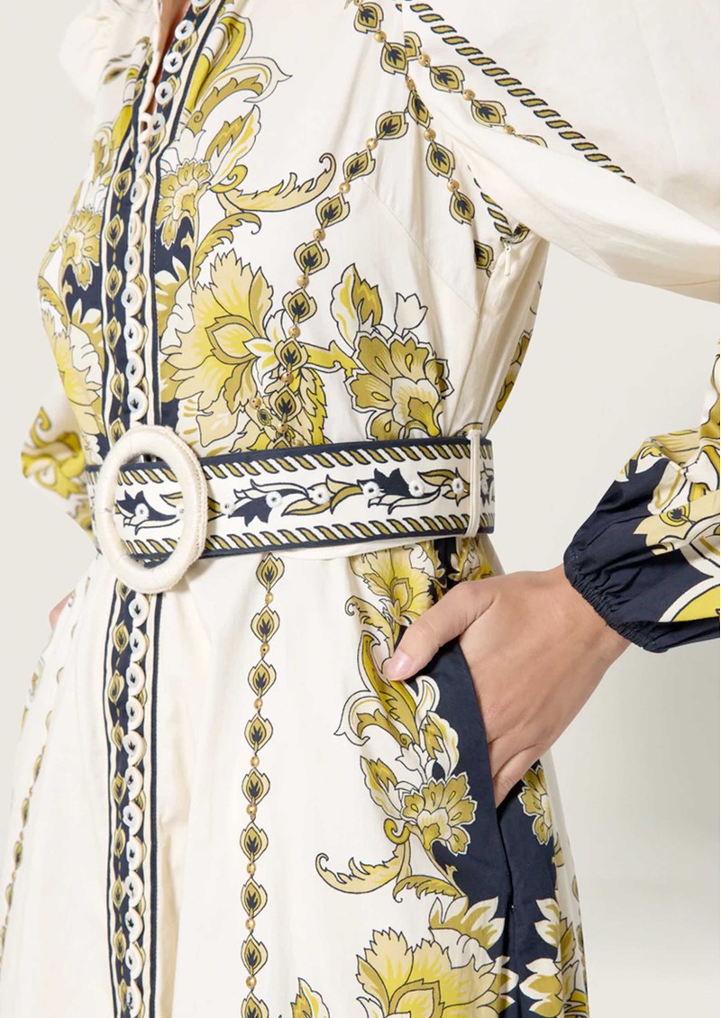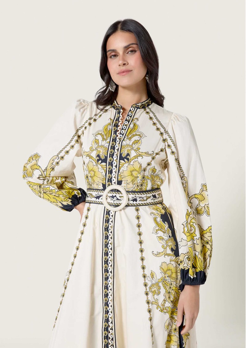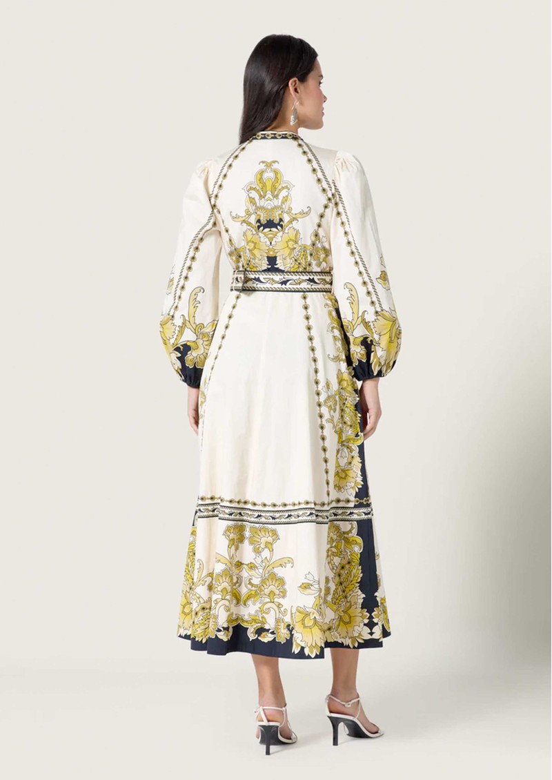 The Scarlett Poppies Baroqueen Floral Dress in papyrus/gold is a refined yet striking midi featuring a sculpted fit-and-flare silhouette, voluminous sleeves, and a detachable belt with a fabric-covered buckle. Adorned with placement-engineered floral prints, shimmering lurex embroidery, and delicate metallic sequins, it combines Art Nouveau-inspired elegance with timeless craftsmanship for a statement day-to-evening piece.