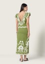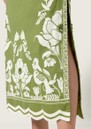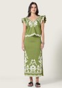 The Scarlett Poppies Sandina Skirt in green/papyrus is an elegant, floor-grazing piece crafted from 100% cotton satin, featuring artisanal French knot embroidery and subtle bead accents. Its straight, timeless silhouette is enhanced by a placement-engineered floral print and a bead-wrapped line at the waist, combining quiet sophistication with handcrafted detail.