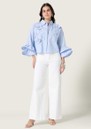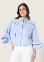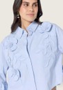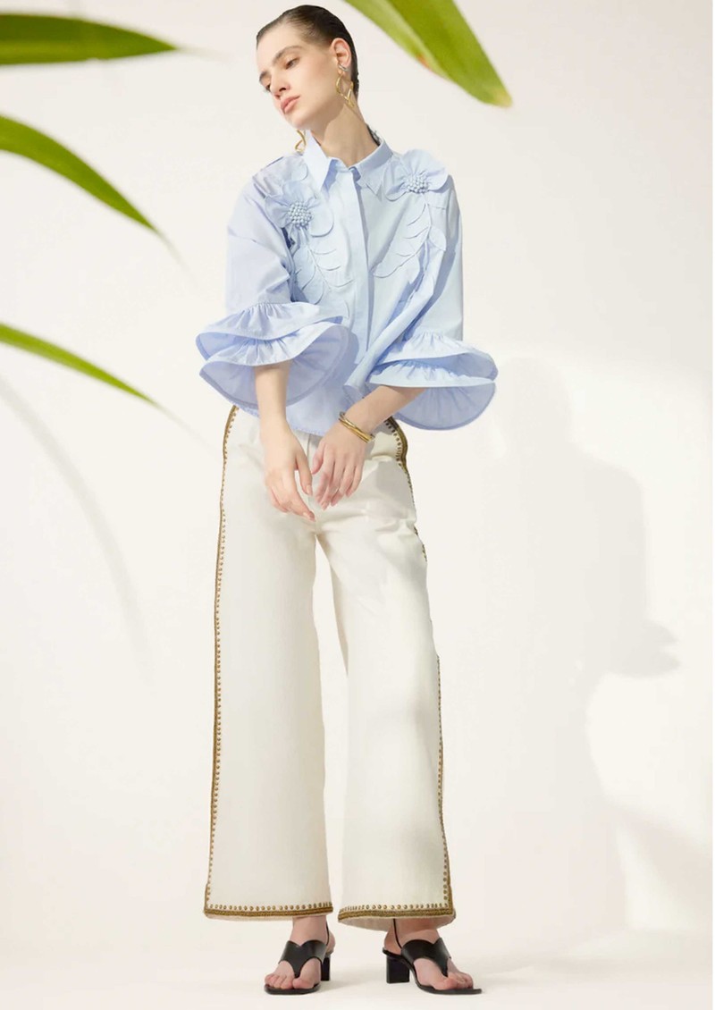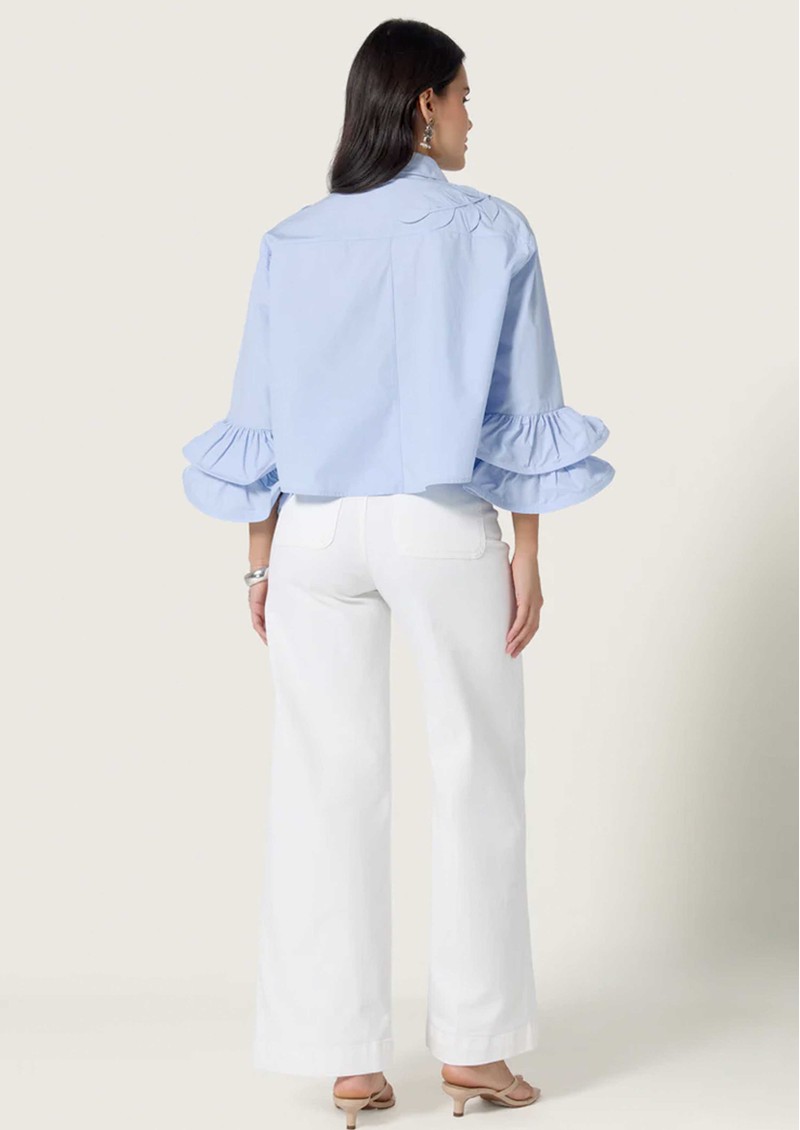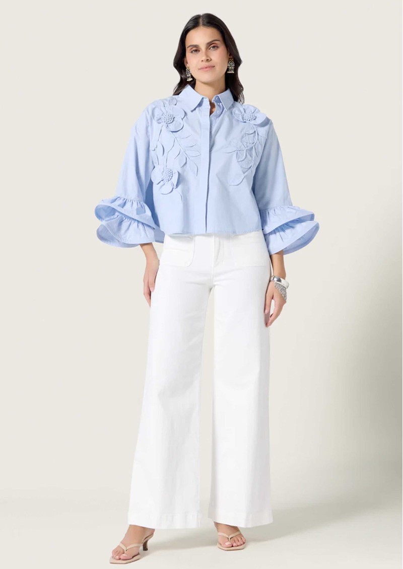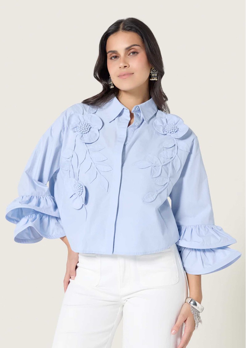 The Scarlett Poppies Siena Top in windsurfer blue is a tailored, straight-shift blouse crafted from 100% cotton poplin, featuring a classic shirt collar, long sleeves, and a full centre-front placket. Its standout detail is the 3D sculptural floral embroidery with raised petals and fabric-covered centres, blending Art Nouveau-inspired artistry with clean, refined structure.