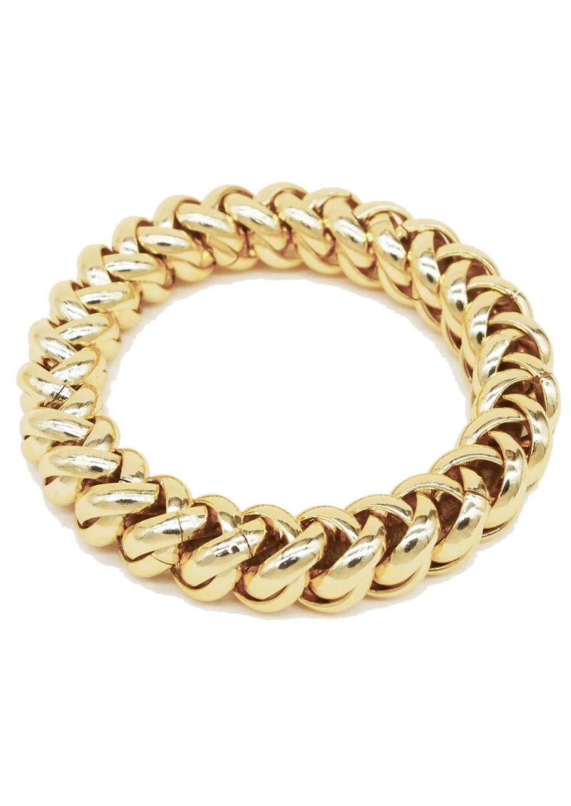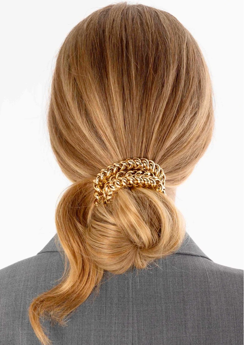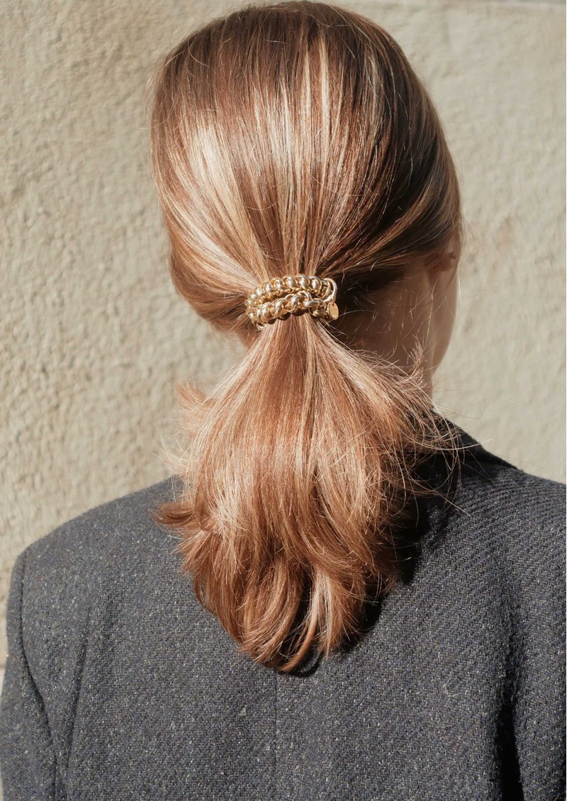 This Scrunchie is Back hair tie is crafted from ultra-resistant elastic and a gold-tone stainless steel chain,