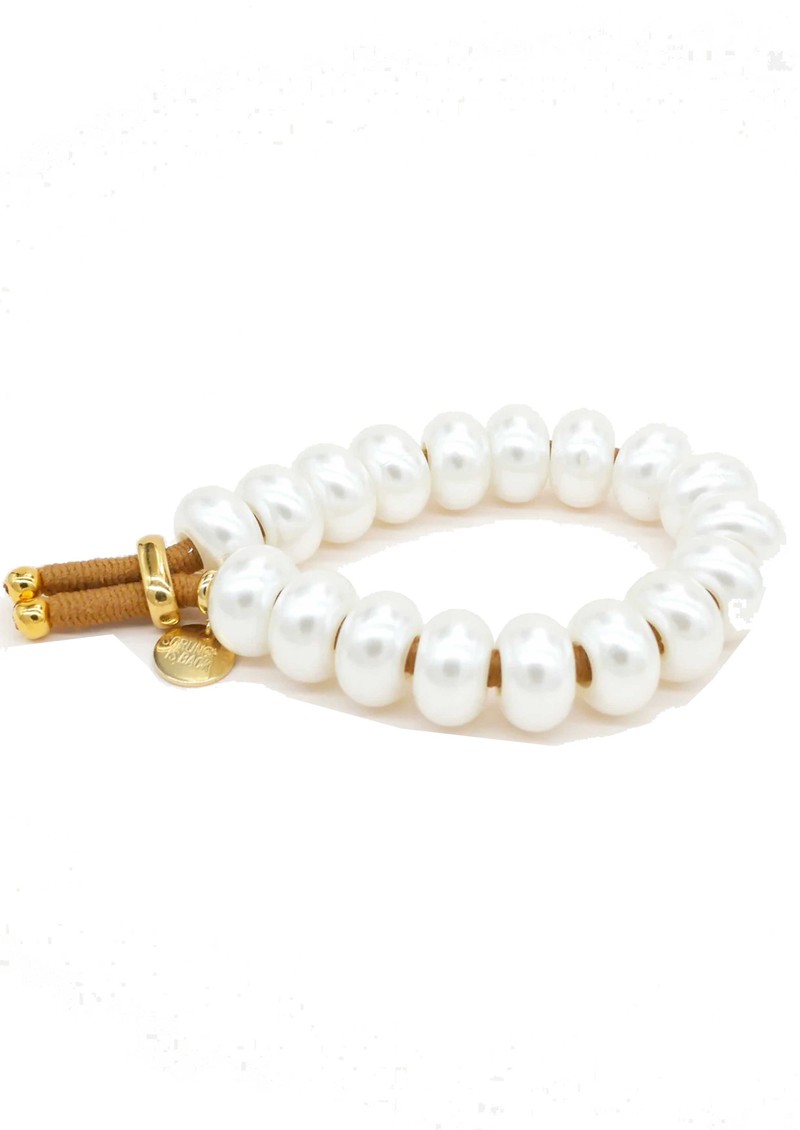 Elevate your look with the Scrunchie is Back Elastic Shell Pearls hair tie/bracelet, featuring rows of donut-shaped pearls with beige elastic and gold-hued details. Made in France from high-quality, ultra-resistant elastic with stainless steel beads for lasting colour, it can be worn around the wrist or in your hair for versatile style.