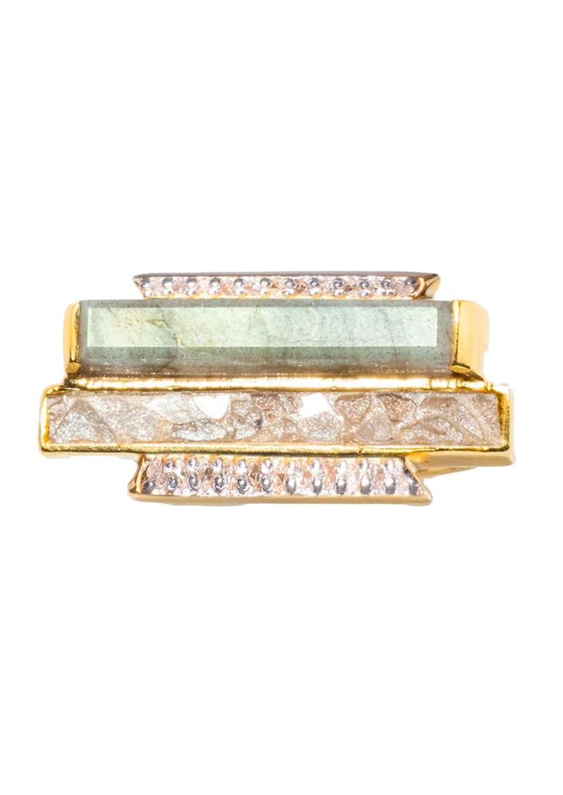 This Shana Gulati ring is made from Sliced raw uncut diamonds, Sand resin, Labradorite, Pave champagne diamonds, Vermeil 18K gold