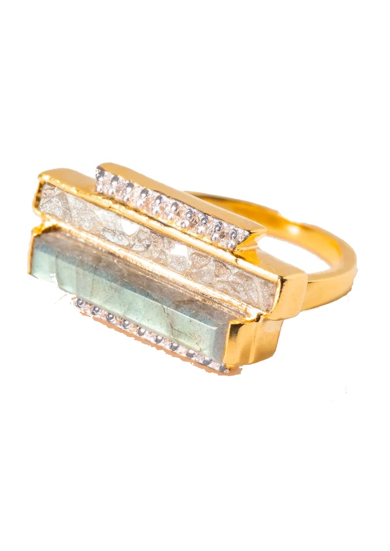 Raising the bar with this Hanover Ring from new brand, Shana Gulati. Featuring gorgeous labradorite stone and champagne diamonds, set within a gorgeous gold plating, this extra special piece also features: