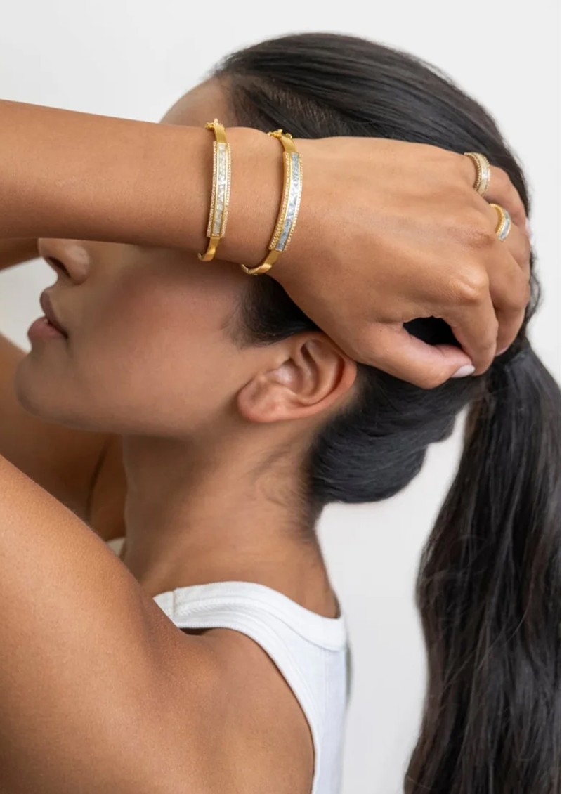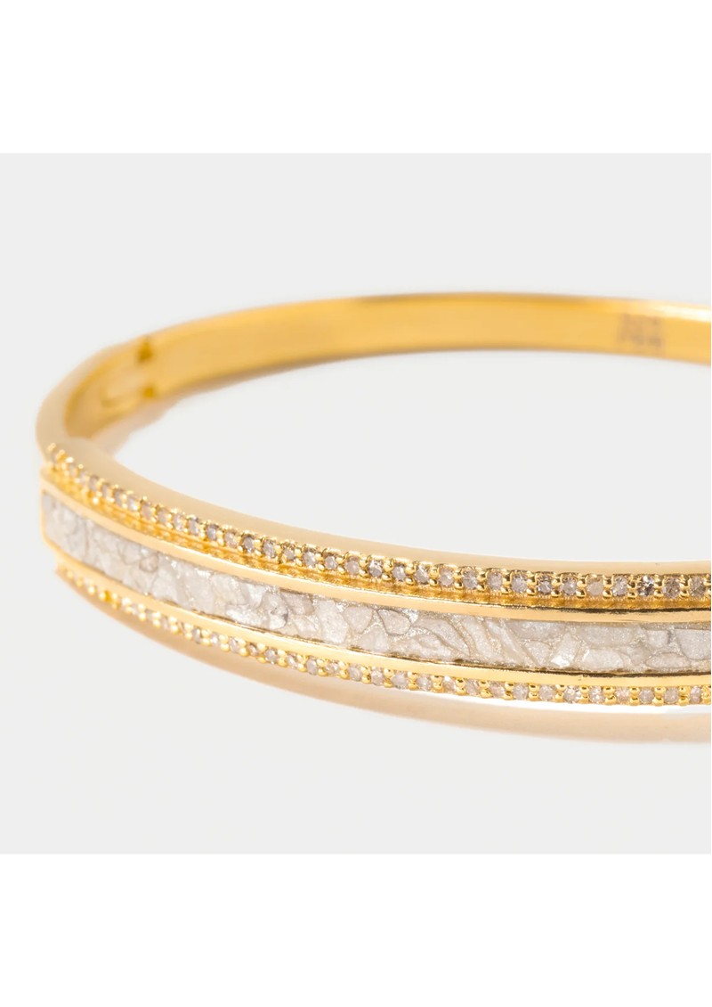 Featuring two lines of shimmering paved diamonds, this Shana Gulati Hapur Pave Diamond Bangle in Gold is a statement, showstopper pieces. Beautifully crafted using ethical practises, this new jewellery brand is not to be missed. This bangle also features: