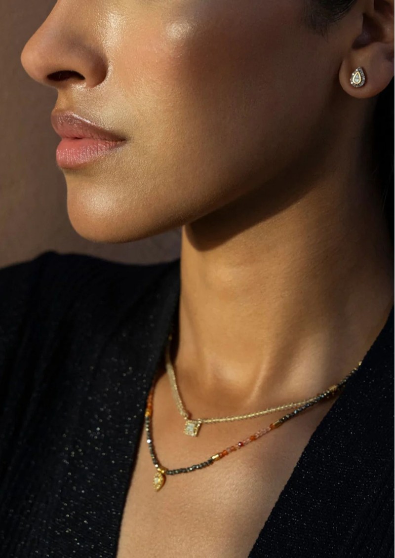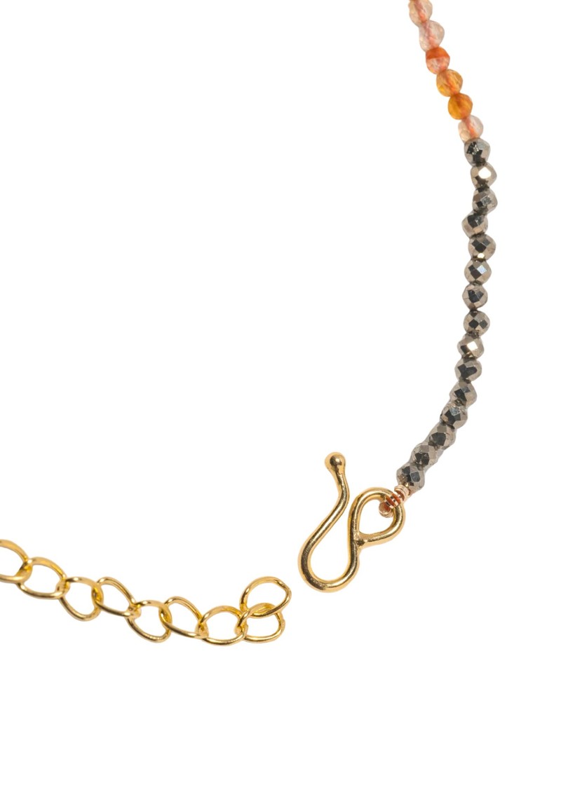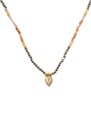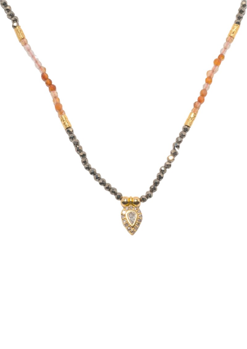 Introducing the Shana Gulati Irving Beaded Necklace. Designed to look like a desert horizon at golden hour, glistening in the sun. This necklace features flashes of carnelian, cool pyrite, and a gold teardrop pendant. We love the talisman style pendant. Key features of this Shana Gulati necklace include: