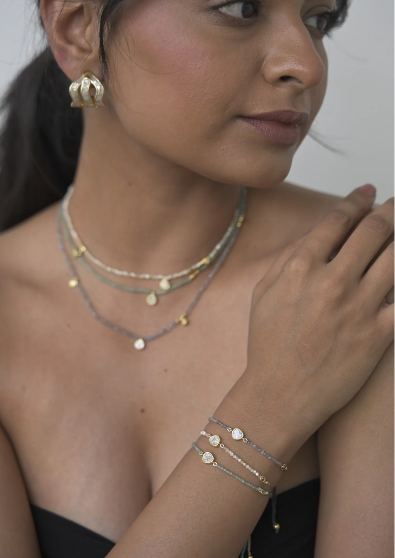 Introducing new jewellery brand Shana Gulati and this stunning Janiza Beaded Bracelet. Made from 18K Gold Vermeil and beautiful Mother of Pearl beads. Adjustable and lightweight, this timeless bracelet will work from day to evening. Other features include: