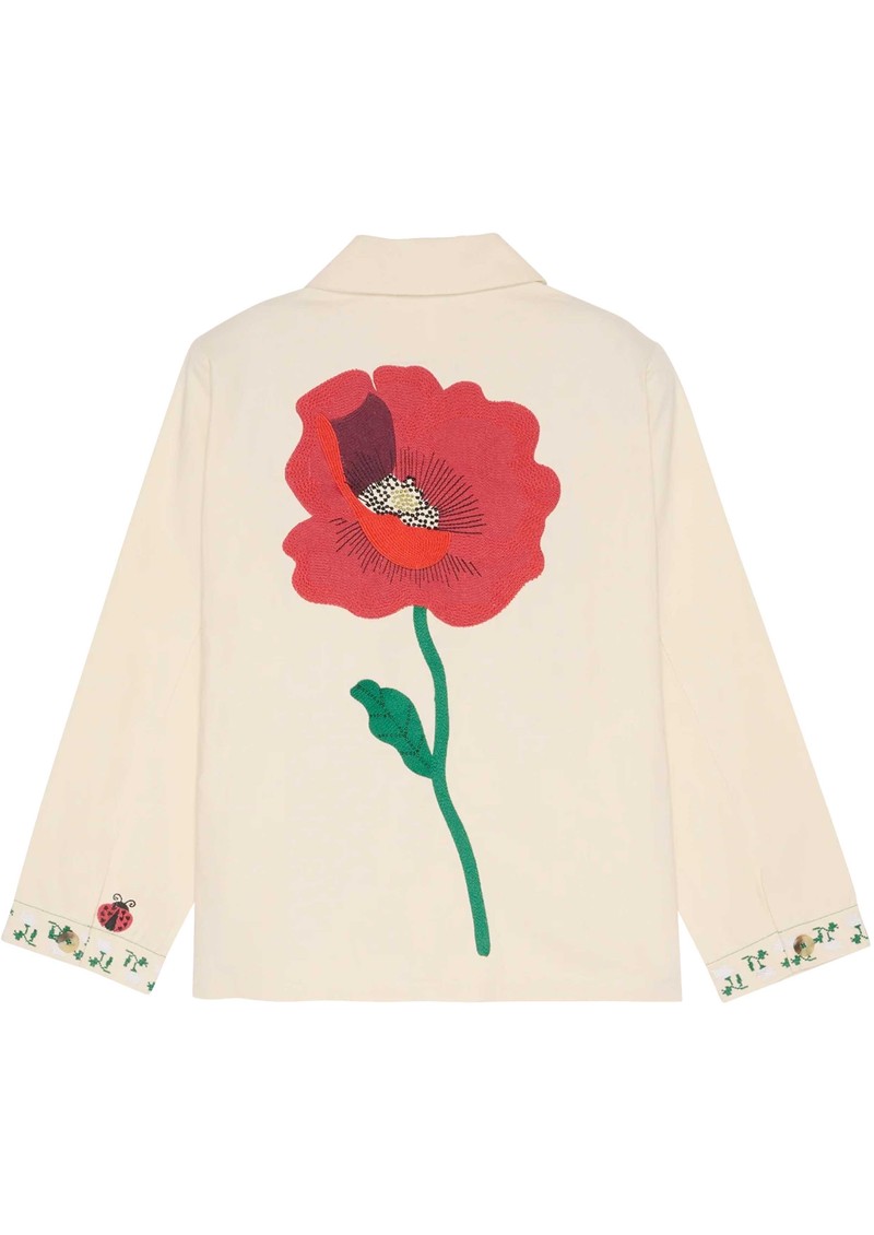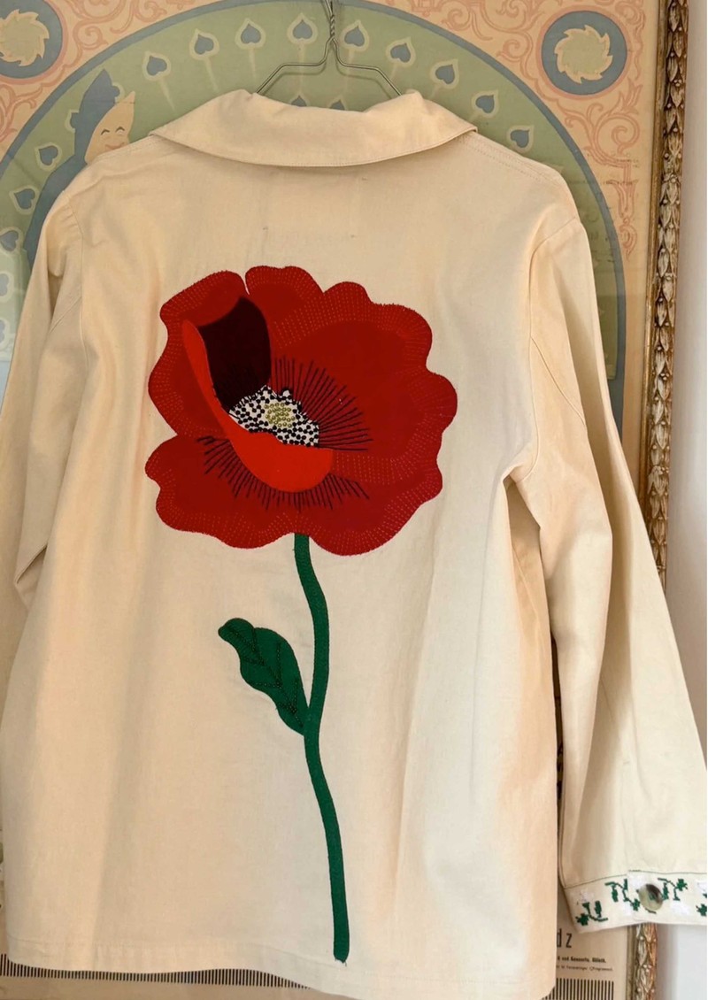 - Intricate embroidery with large poppy design on the back