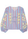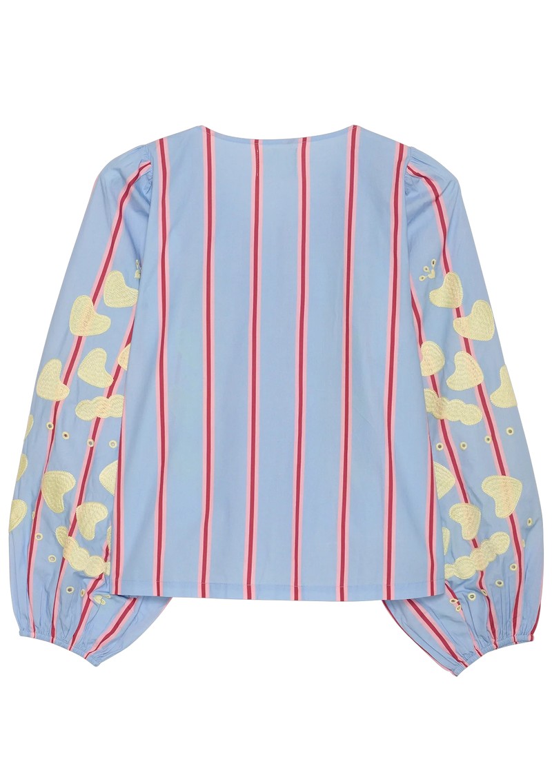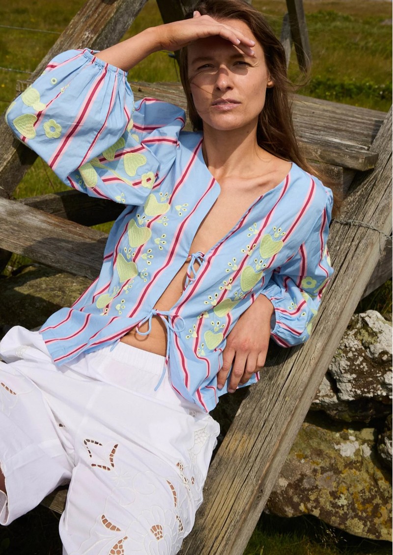 Introducing the beautiful Elisabeth Top from new brand Sissel Edelbo, which has been crafted from 100% organic cotton poplin. Featuring voluminous sleeves, an open front with bow tie strings and decroated with a combination of stripes and heart embroidery. Other features include: