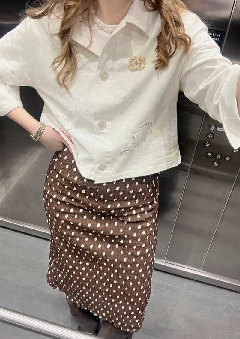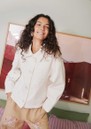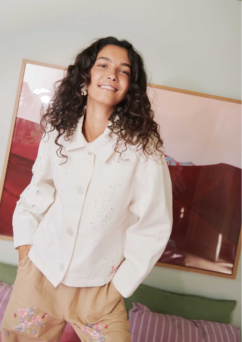The Sissel Edelbo Vintage Jacket in White Napkin combines timeless elegance with artisanal detail. Crafted from 100% organic cotton twill, it features a relaxed fit, a wide front placket with light mother-of-pearl buttons, long sleeves with wide cuffs, and a floral-lined interior, making it both stylish and eco-conscious.