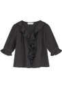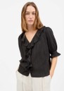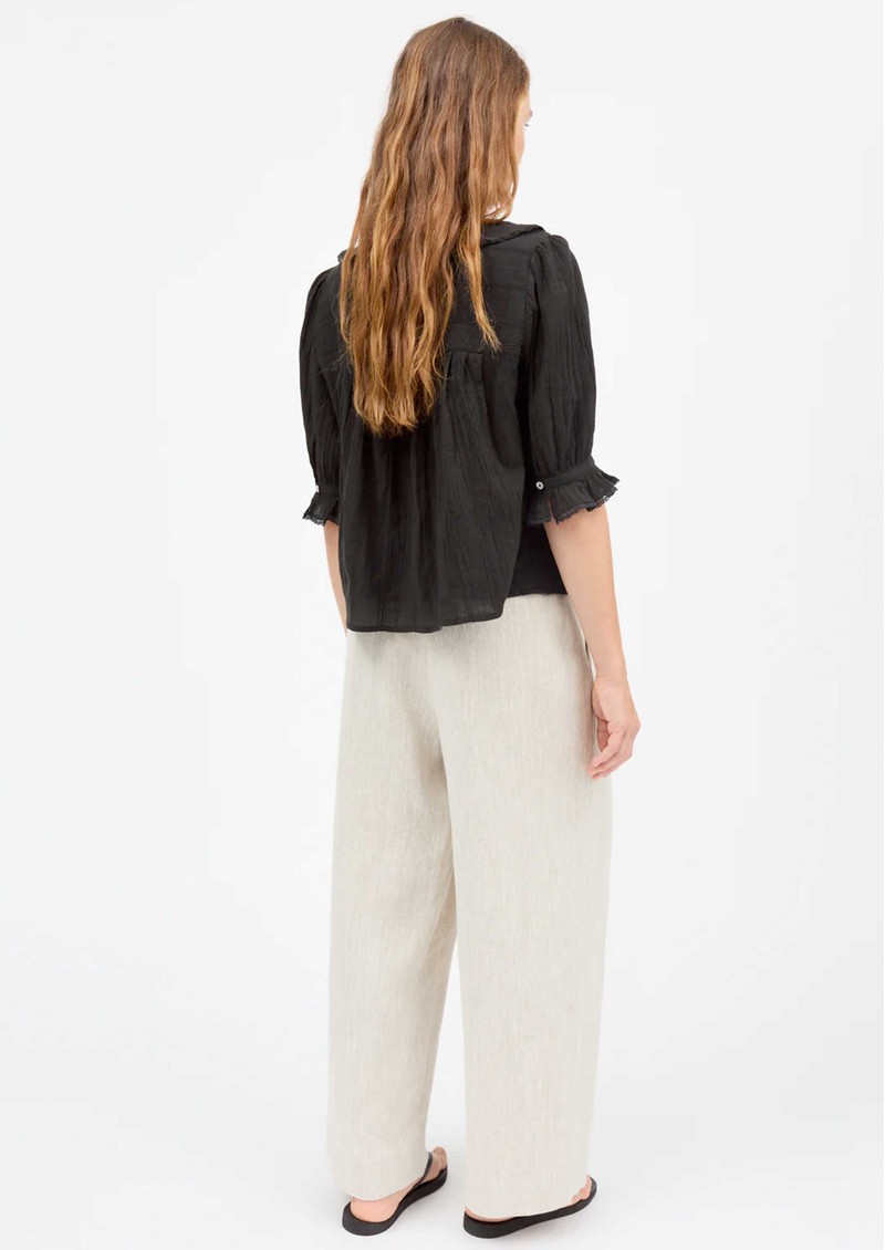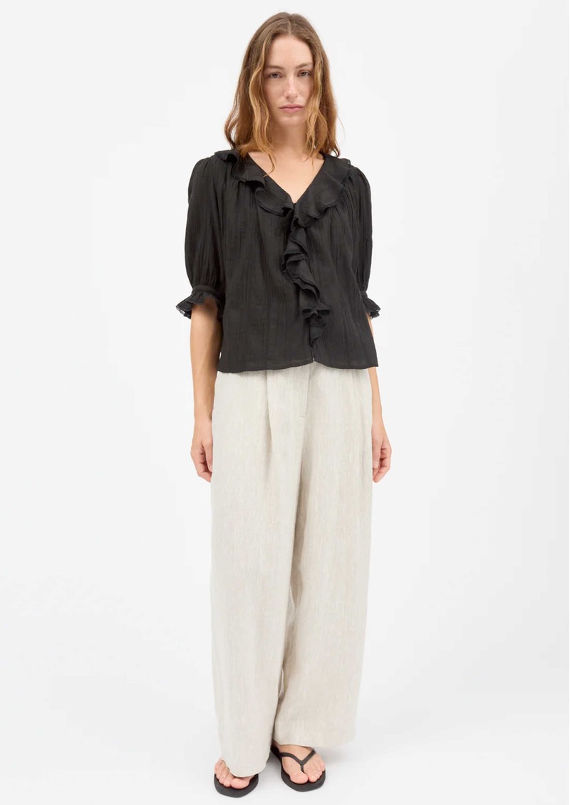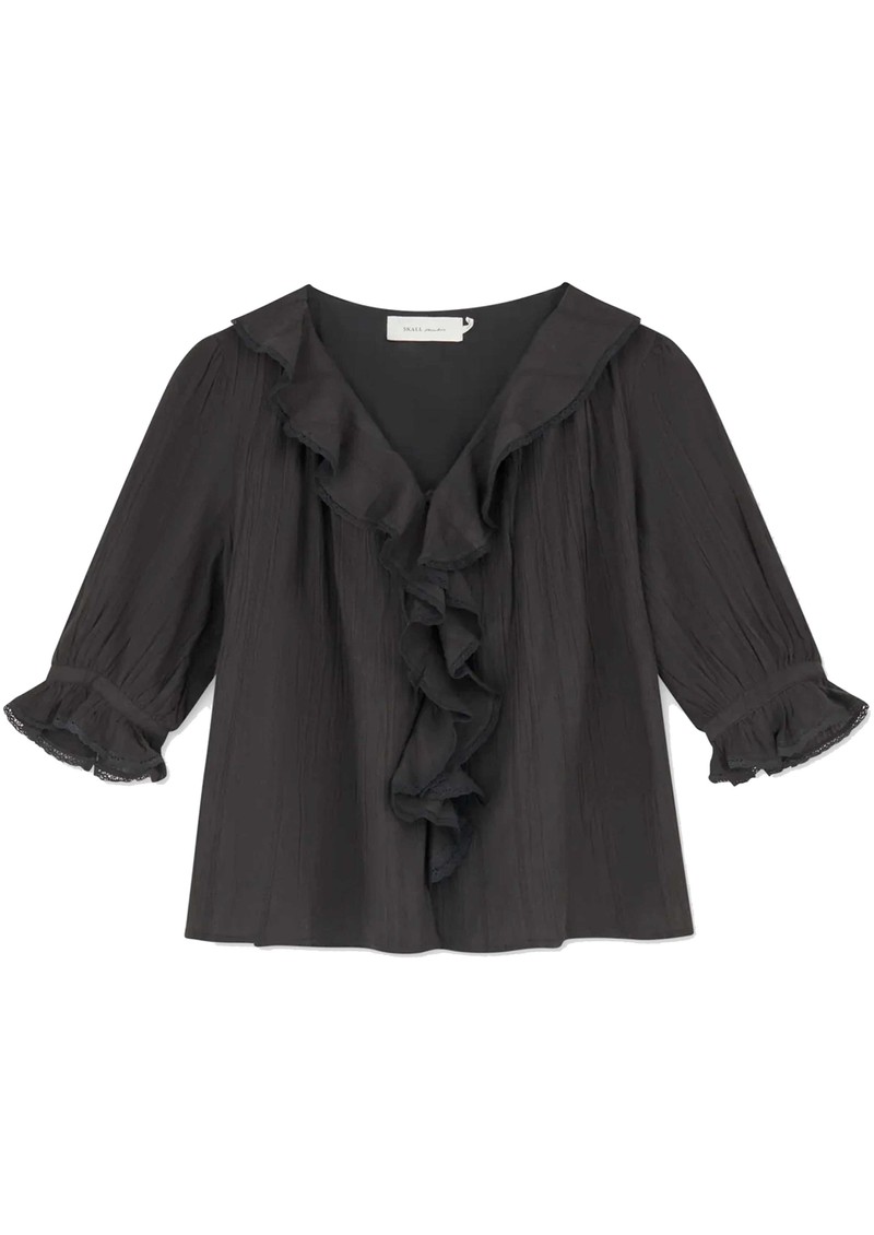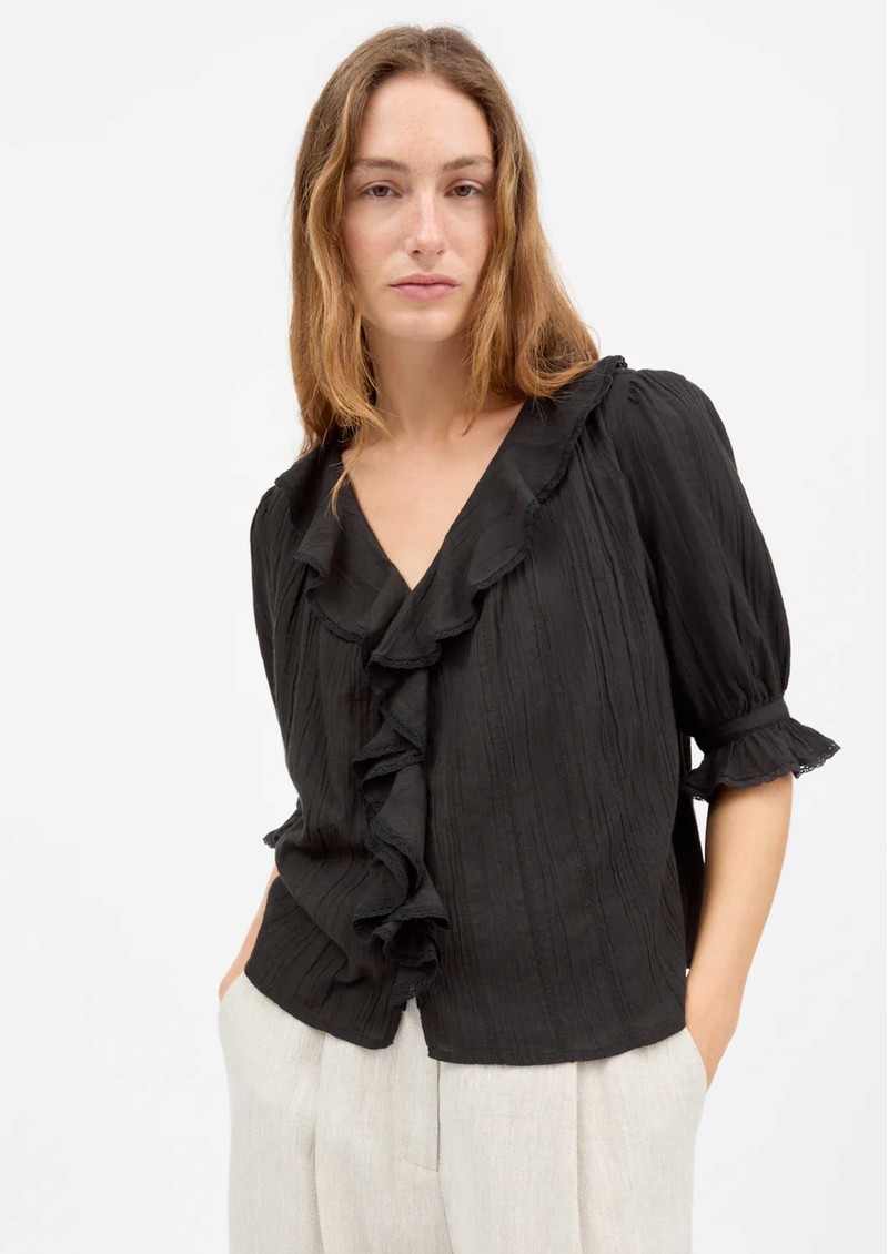 Feminine and effortlessly elegant, the Skall Studio Clea Blouse in Black features a V-neck with ruffled edge, half-length puffy sleeves, and pleated details at the front and back for added volume. Crafted from 100% GOTS-certified organic cotton, it combines sustainable materials with a timeless, versatile silhouette.