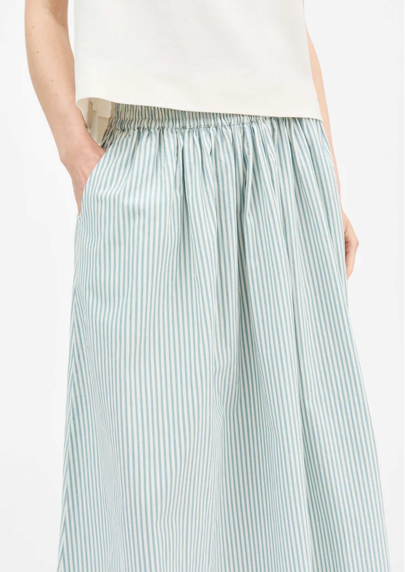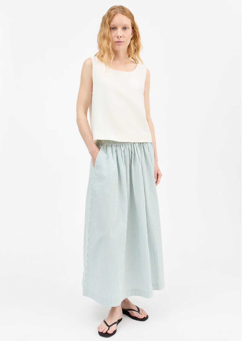 The Skall Studio Dagny skirt is a fresh white and aqua stripe style with a soft, voluminous shape that moves beautifully and feels effortless to wear. Crafted from 100% organic cotton with an easy elastic waist and practical side pockets, it’s a comfortable everyday piece made with conscious quality.