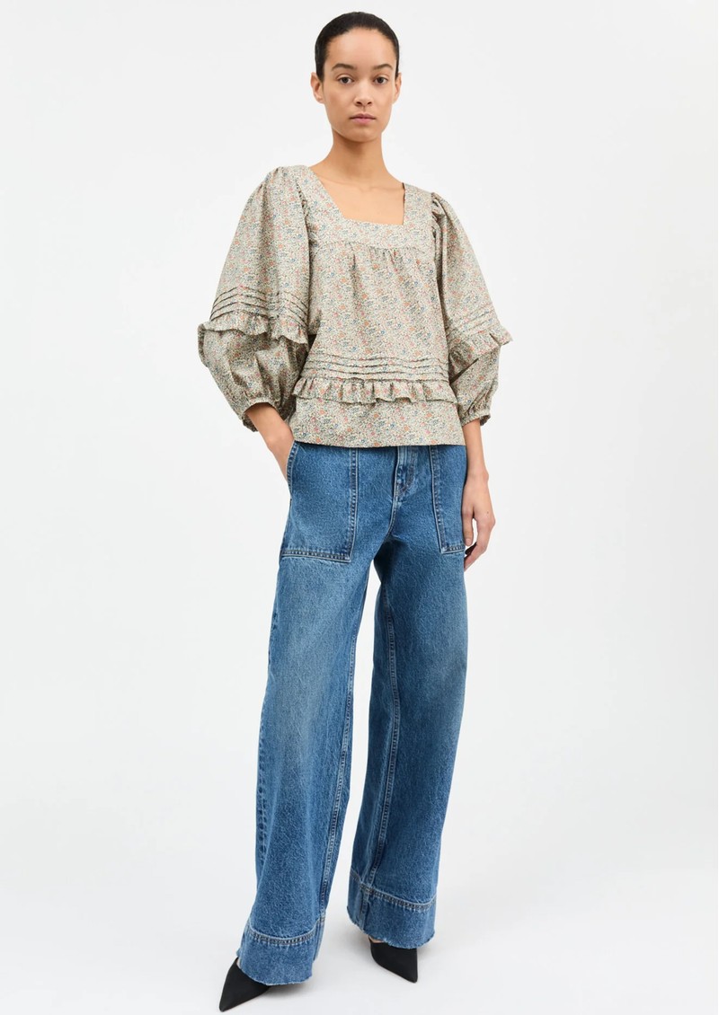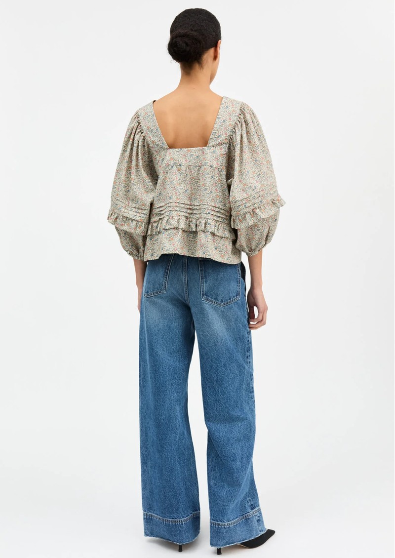 The Skall Hope Blouse in Flower Field features a romantic square neckline, three-quarter sleeves, and delicate pleat and ruffle detailing. Made from 100% organic cotton Liberty fabric, it has a low back and airy silhouette, perfect for a light, feminine statement piece.