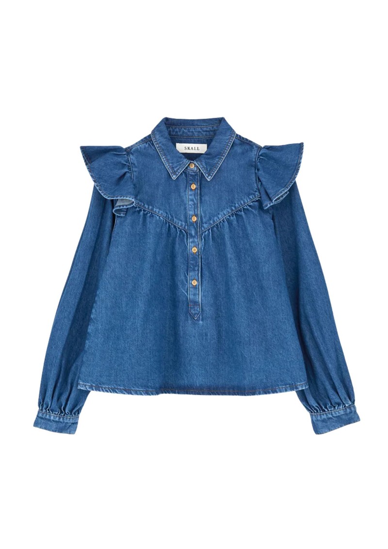 Introducing the Mille blouse from Skall. Crafted from organic cotton this stunning denim blouse features a classic collar with ruffle shoulder detail and voluminous sleeves - a real staple for your wardrobe.