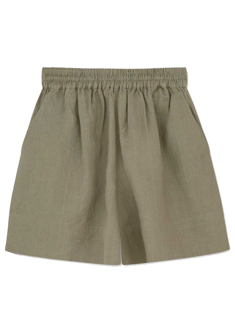 Effortlessly relaxed, the Skall Studio Vetiver Shorts in Khaki feature a wide-leg silhouette, subtle pleating, and side pockets, crafted from 100% breathable linen with an elastic waistband for all-day comfort.