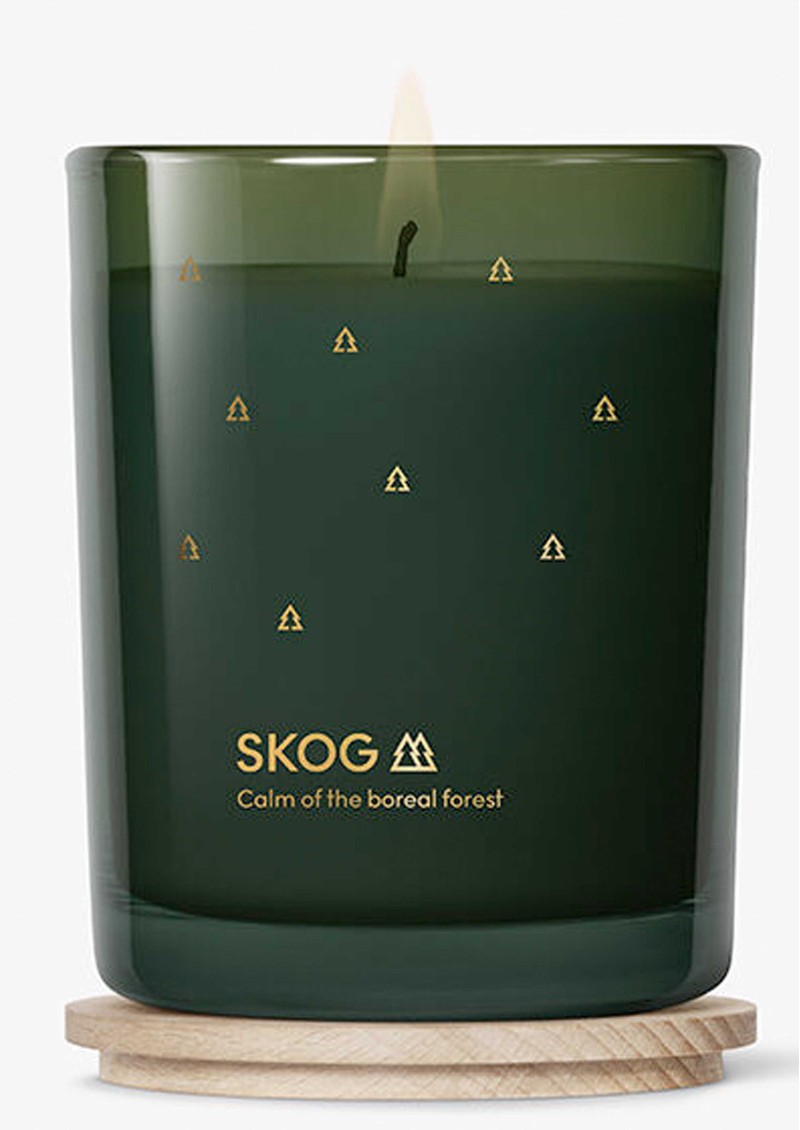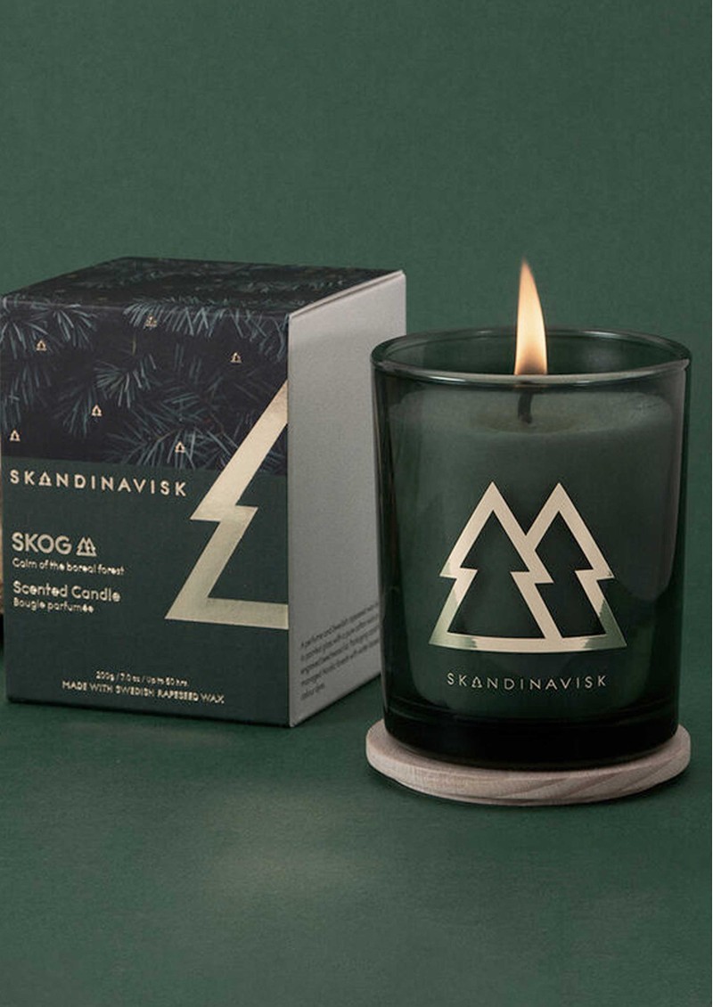 The Skog Gold candle is made from sustainably farmed, non-GMO Swedish rapeseed wax blended with essential oils, safe synthetic fragrances, and a pure cotton wick, housed in partially recycled glass with FSC-certified packaging.