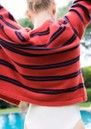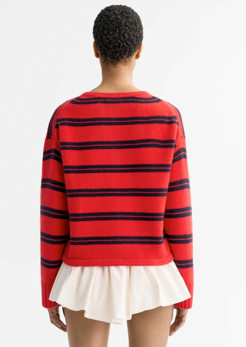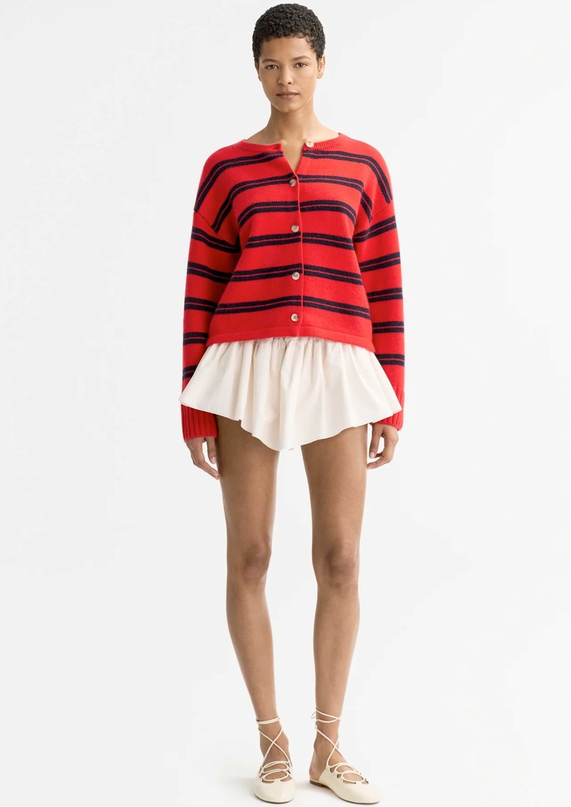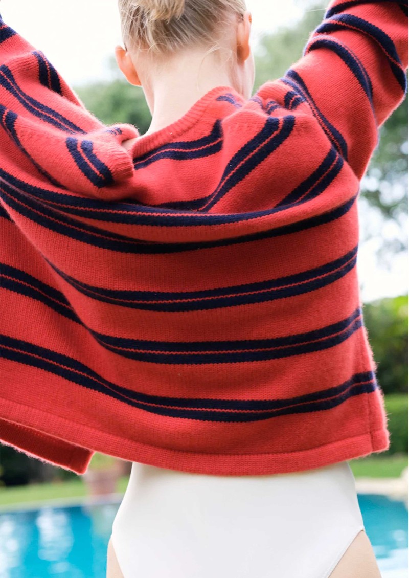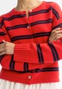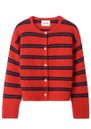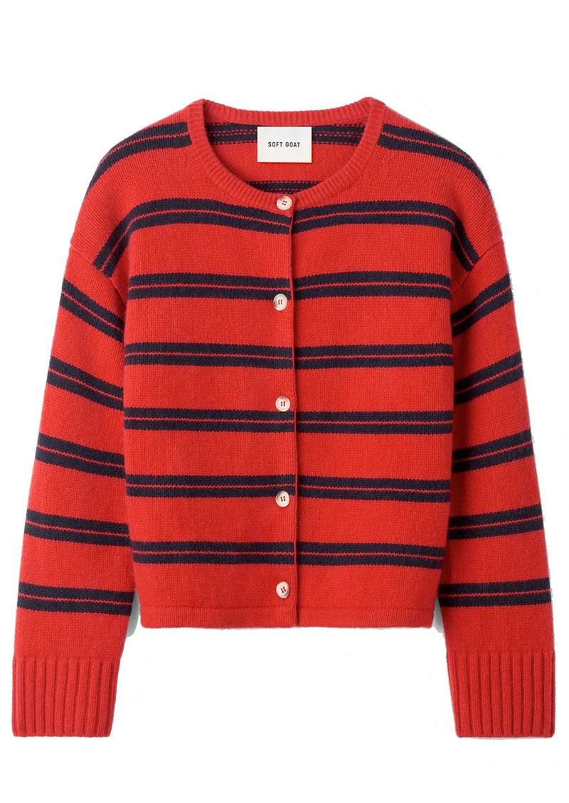 Introducing the Soft Goat striped cardigan in a vibrant tomato red with navy stripes, crafted from 100% cashmere for a soft, cosy feel. With a crew neckline, long sleeves, central button closure, and ribbed edges, it brings a playful yet polished touch to any layering piece.