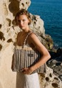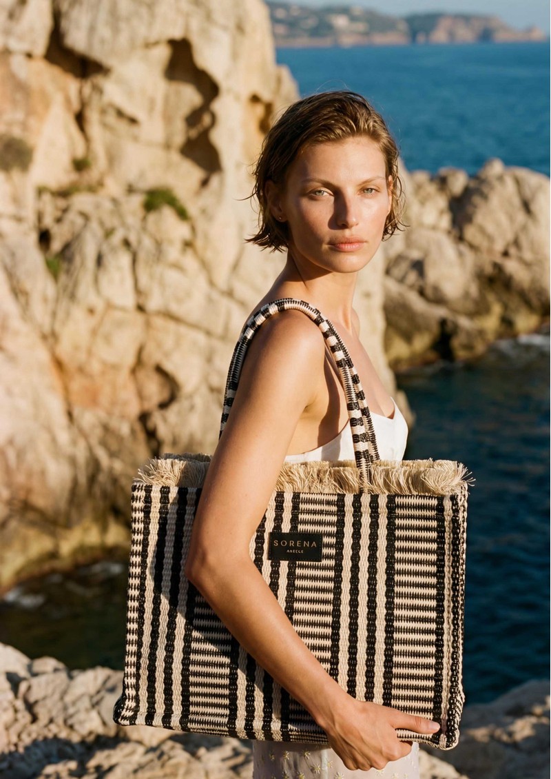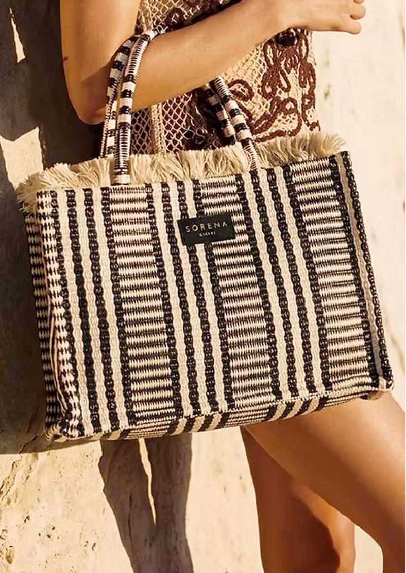 Elevate your everyday with the Sorena Ammos Medium Tote in Natural, a beautifully structured statement bag handcrafted in Greece with signature red lining and striking geometric woven design. Blending timeless style with artisanal craftsmanship, this versatile tote features a secure zip-top closure, detachable shoulder strap, and refined fringe detailing for effortless sophistication.