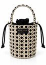 Chic and structured, the Sorena Positano Kalathaki Bag features a barrel-shaped silhouette with a light-hued woven exterior and a black fabric interior, complete with a drawstring closure and two short handles for easy carrying. Subtle gold hardware and a central Sorena logo add a refined, artisanal touch to this versatile everyday bag.