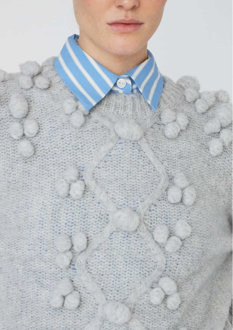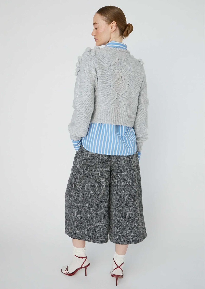 The Stella Nova Cable Knit Jumper in light grey is a playful yet cosy wool sweater, crafted with long sleeves, a round neckline, and decorative knitted bobbles for added texture. Its slightly cropped length makes it ideal for pairing with high-waisted skirts or trousers, combining comfort with contemporary style.