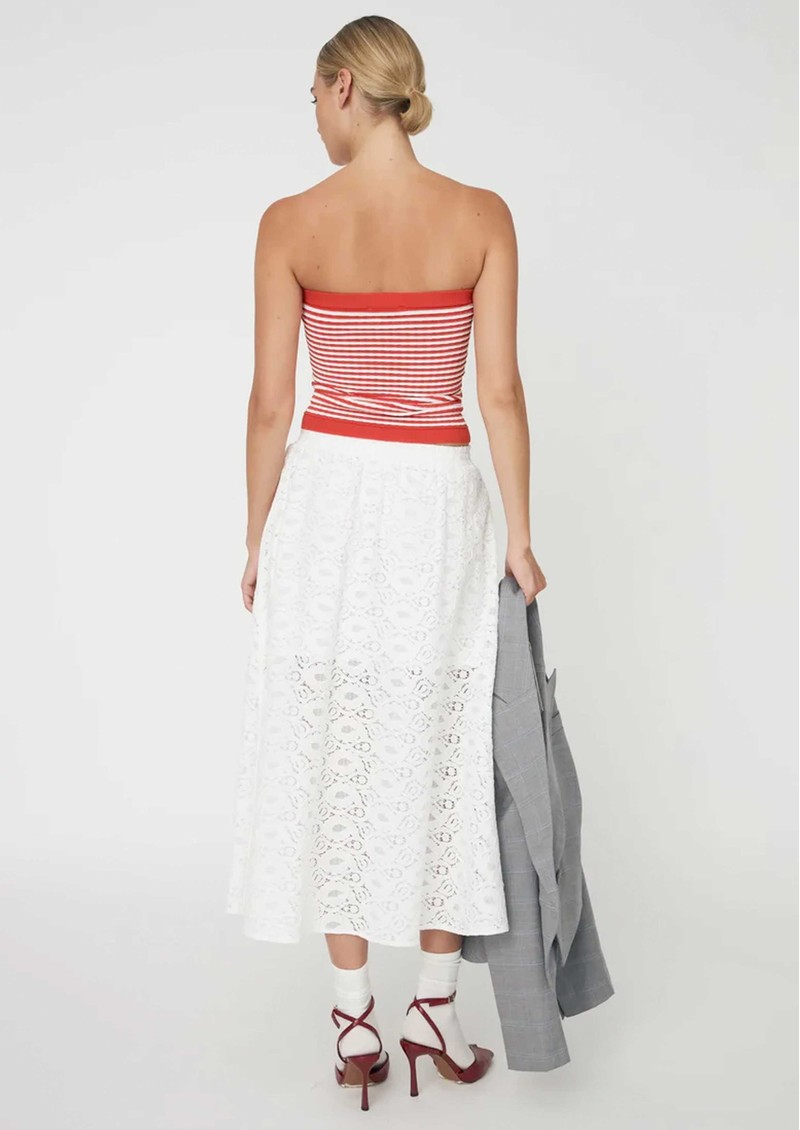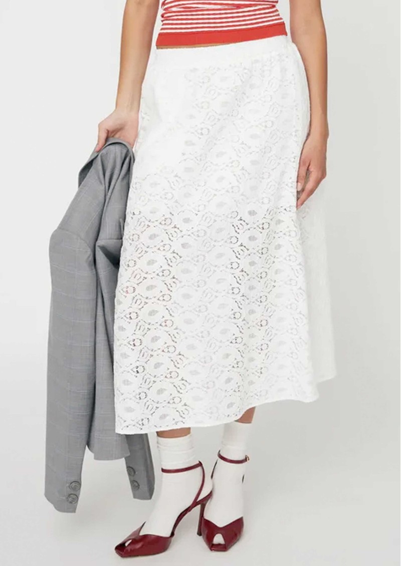 The Stella Nova Cotton Lace Skirt in White is a delicate, midi-length A-line skirt with an elasticated waist for a comfortable, flattering fit. Lined for coverage, its intricate lace fabric adds a touch of elegance and feminine charm.
