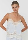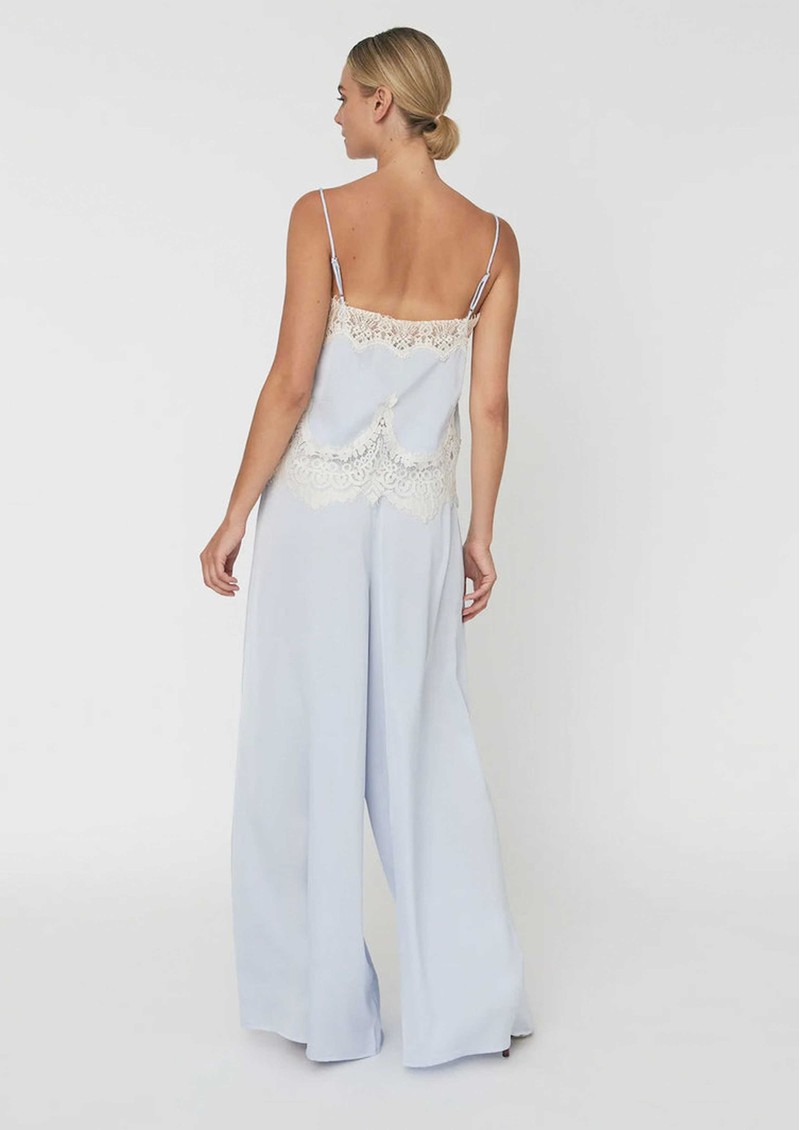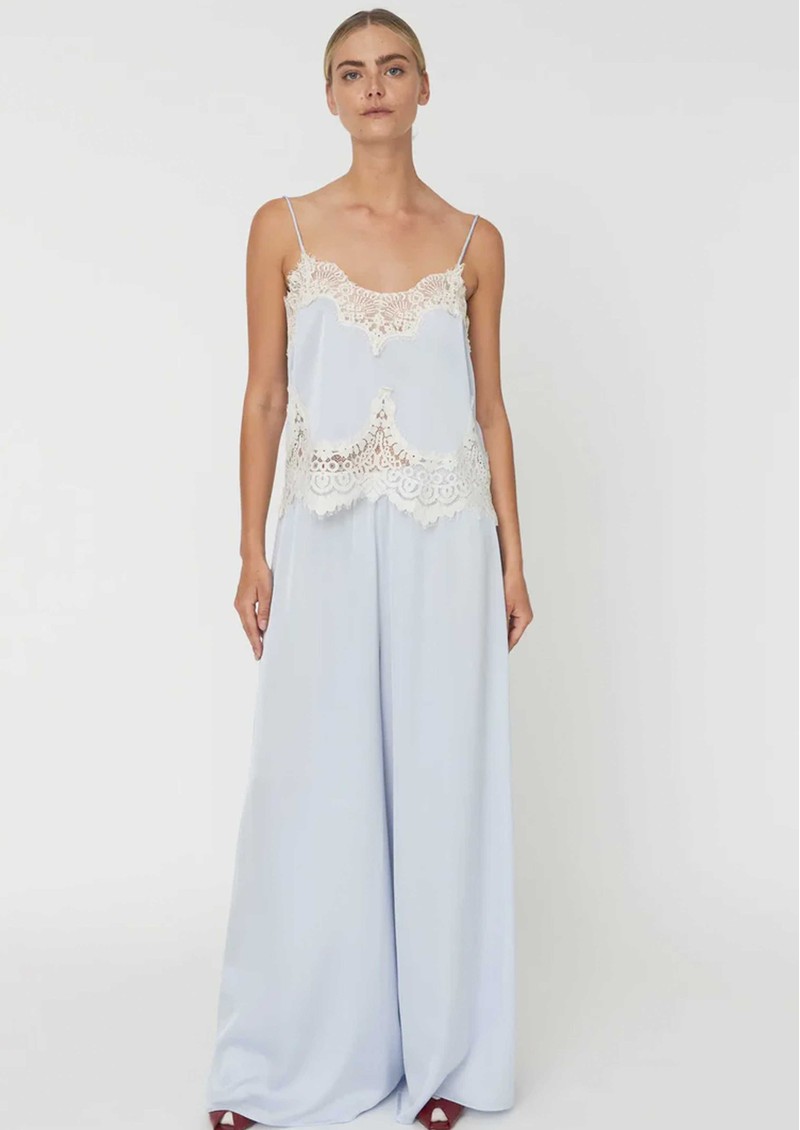 The Stella Nova Delicate Lace Top in dust blue is a graceful camisole designed with fine lace details along the neckline and hem, and adjustable straps for a customised fit. Made from lightweight recycled polyester, it drapes beautifully for a soft, feminine silhouette.
