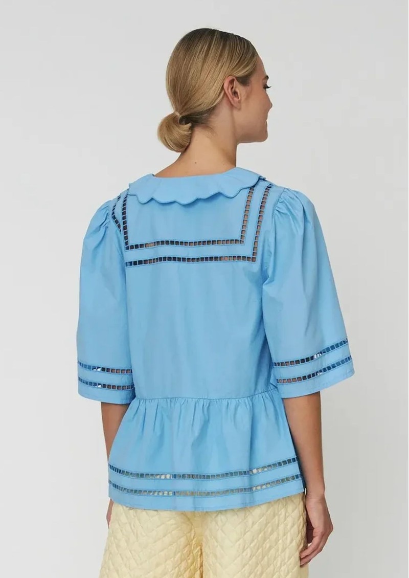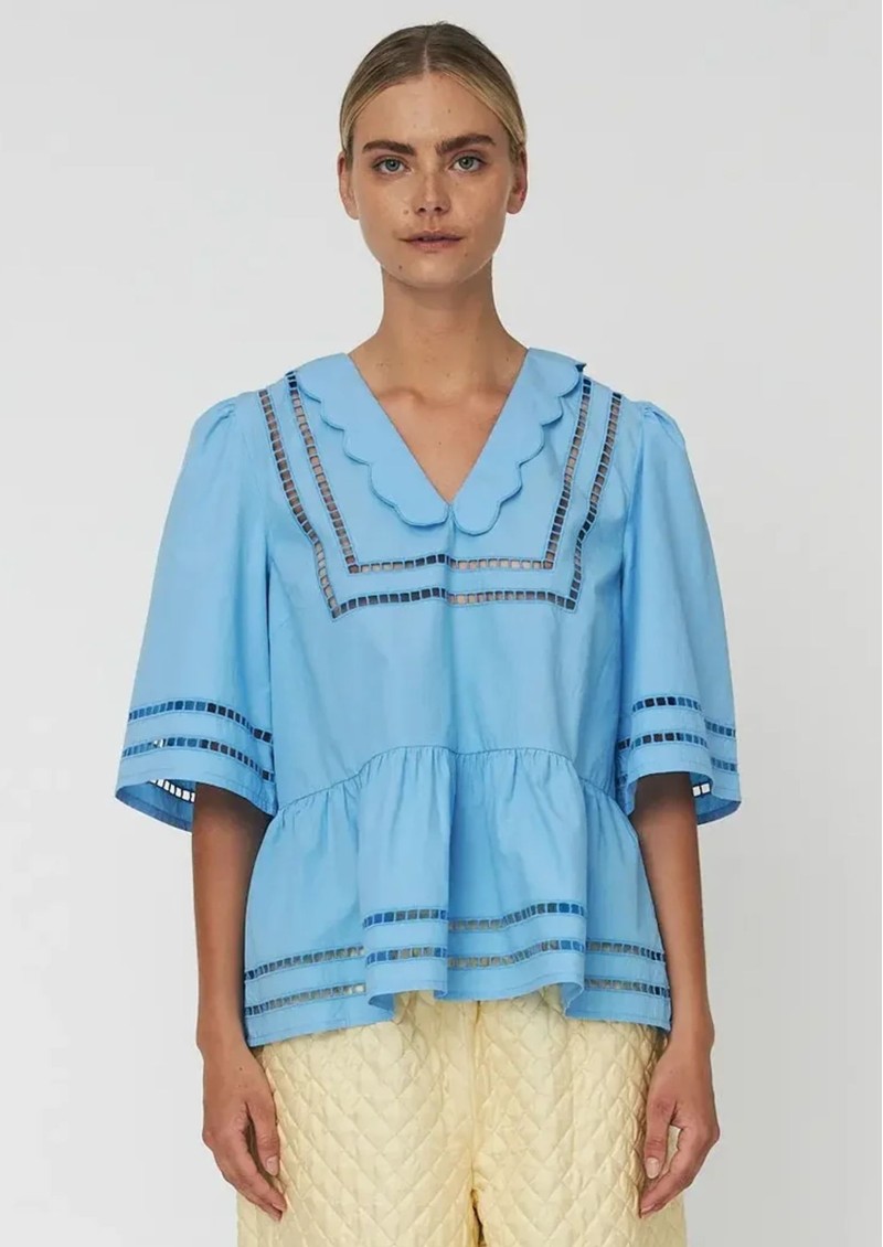 Introducing the Stella Nova Scalloped Edge Collar Top. Crafted from 100% organic cotton, this pretty blouse features a sailor inspired design, complete with scalloped statement collar, open ladder embroidery, and a head-turning blue colour. Key features of this Stella Nova top are: