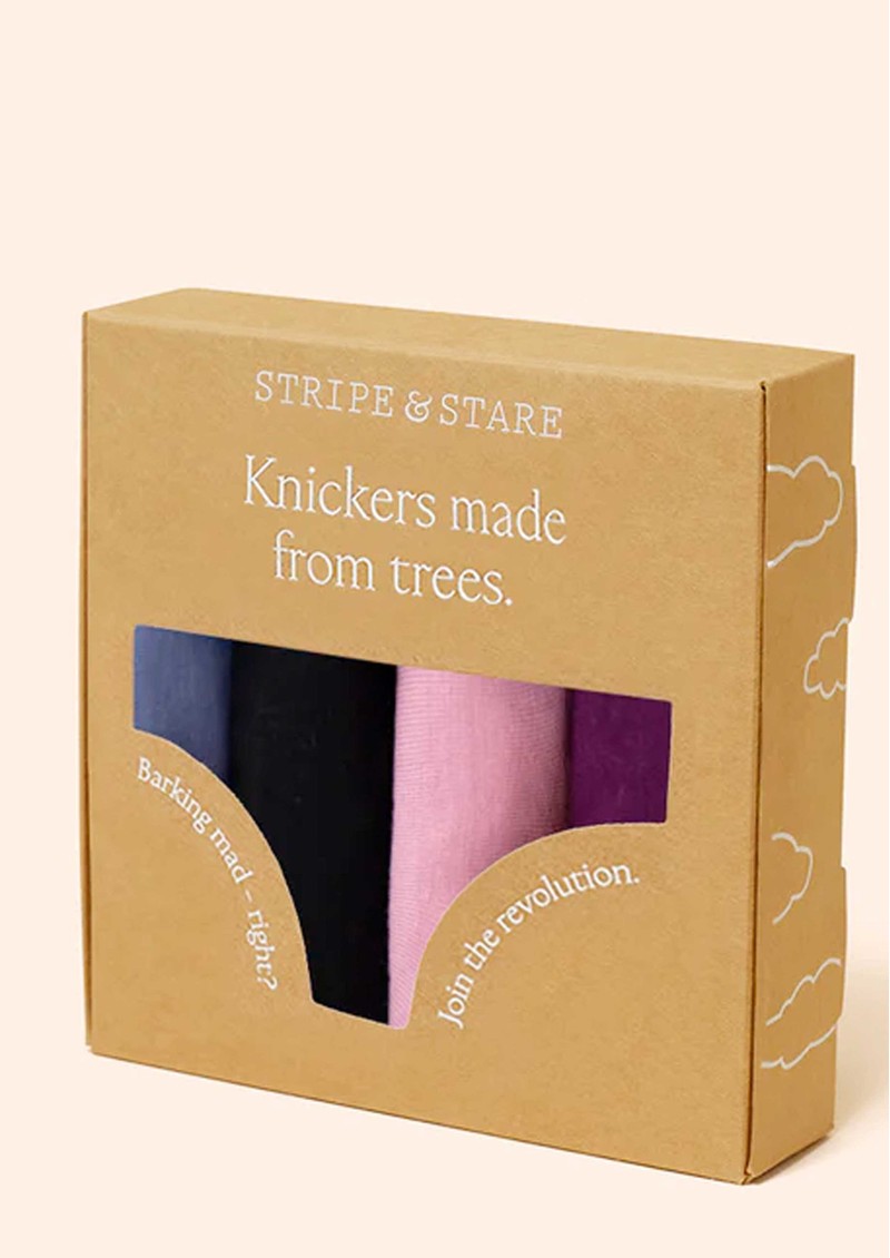Refresh your lingerie drawer with the Stripe and Stare Brief Set of 4 in Black Cherry, Blue, Black Pink, and Burgundy, featuring a fun mix of stripes and dots in rich, vibrant hues. Crafted from silky-soft, biodegradable TENCEL™ Modal, each knicker offers lightweight comfort, flat-locked seams, delicate bow detailing, and comes beautifully gift-boxed with sustainability at its heart.