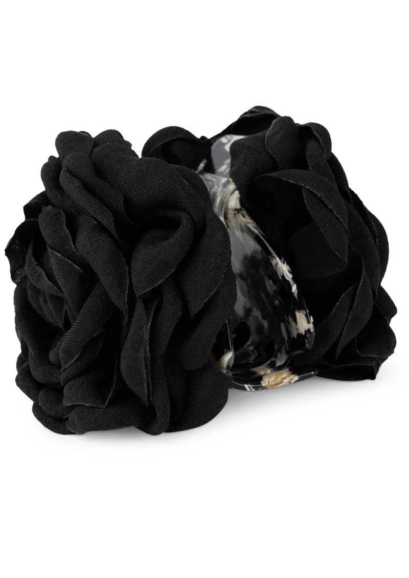 - Black fabric 3D flowers on a glossy acetate claw clip