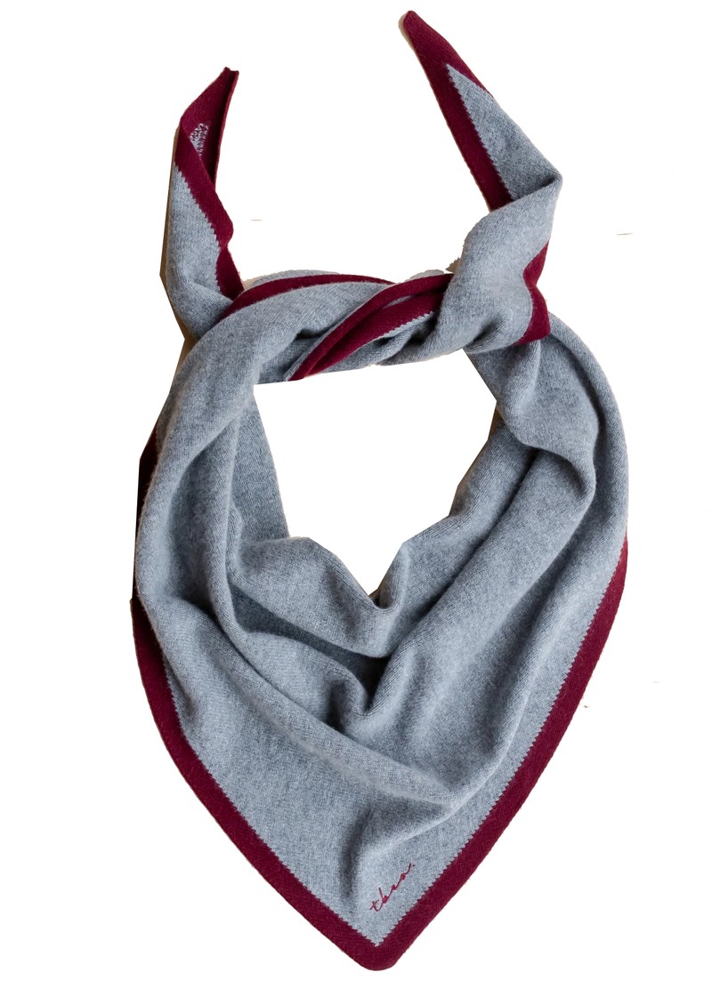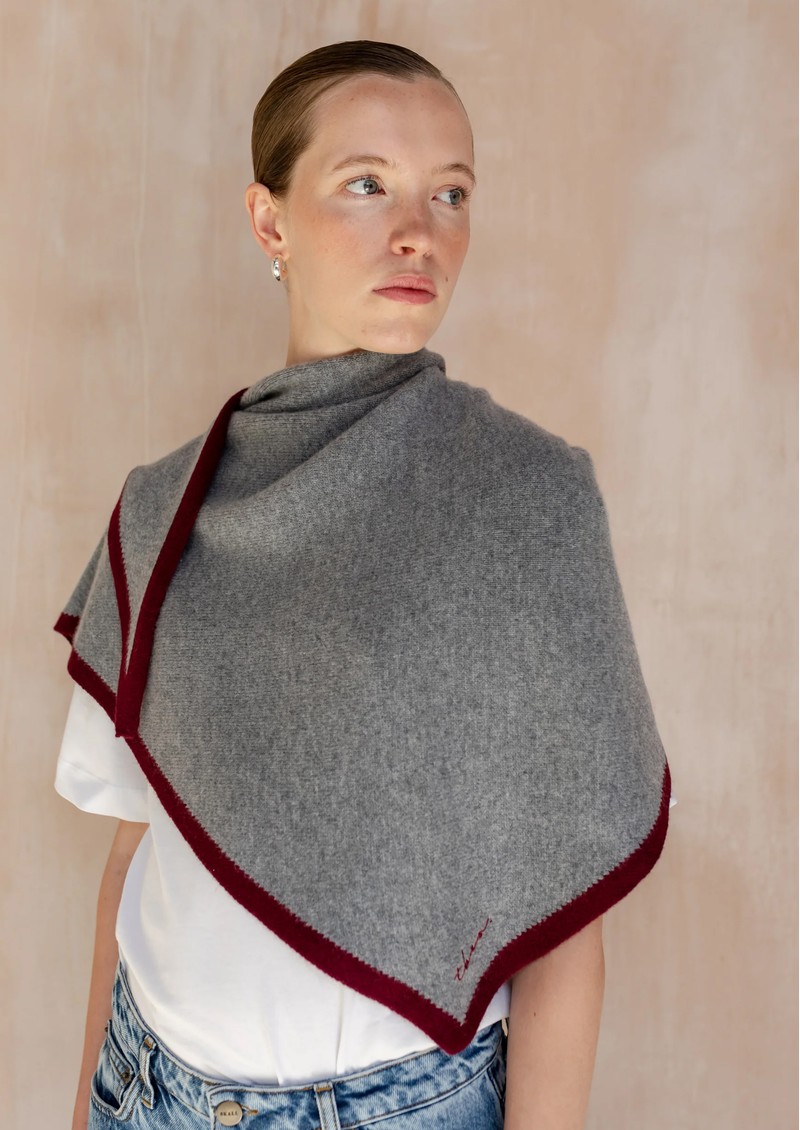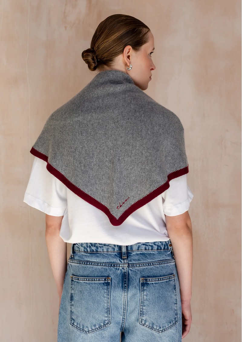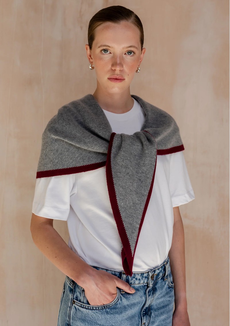 Introducing the TBCo Large Triangle Scarf in Charcoal and Burgundy. This Scandi inspired scarf adds a fun touch to any outfit. Crafted from luxurious merino wool, this scarf can be styled in countless ways, offering endless options, and serves as the perfect finishing touch you'll return to again and again.