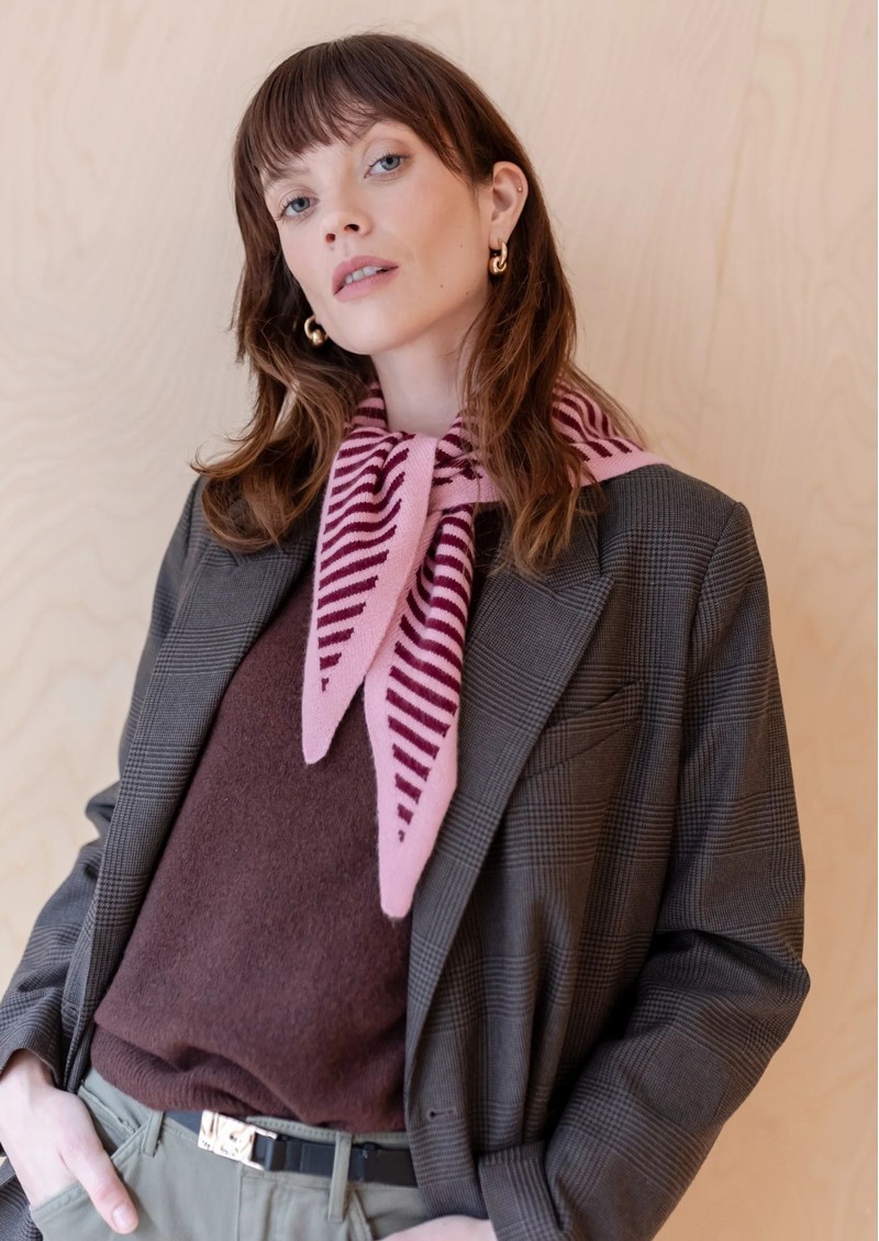 Introducing the TBCo Triangle Scarf in Pink Rust. This Scandi inspired scarf adds a fun touch to any outfit. Crafted from luxurious merino wool, this scarf can be styled in countless ways, offering endless options, and serves as the perfect finishing touch you'll return to again and again.
