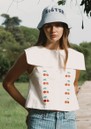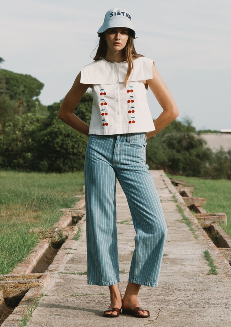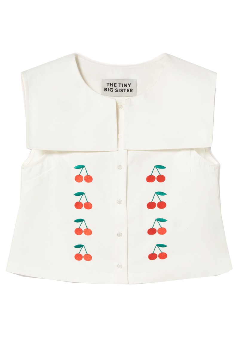 Feminine and super chic, meet The Tiny Big Sister Cherries Top, designed in a crisp white cotton. This sleeveless, sailor inspired shape features embroidered cherries on the front for a Wimbledon inspired look. Other features include: